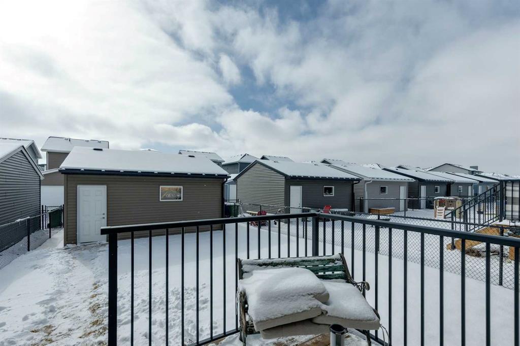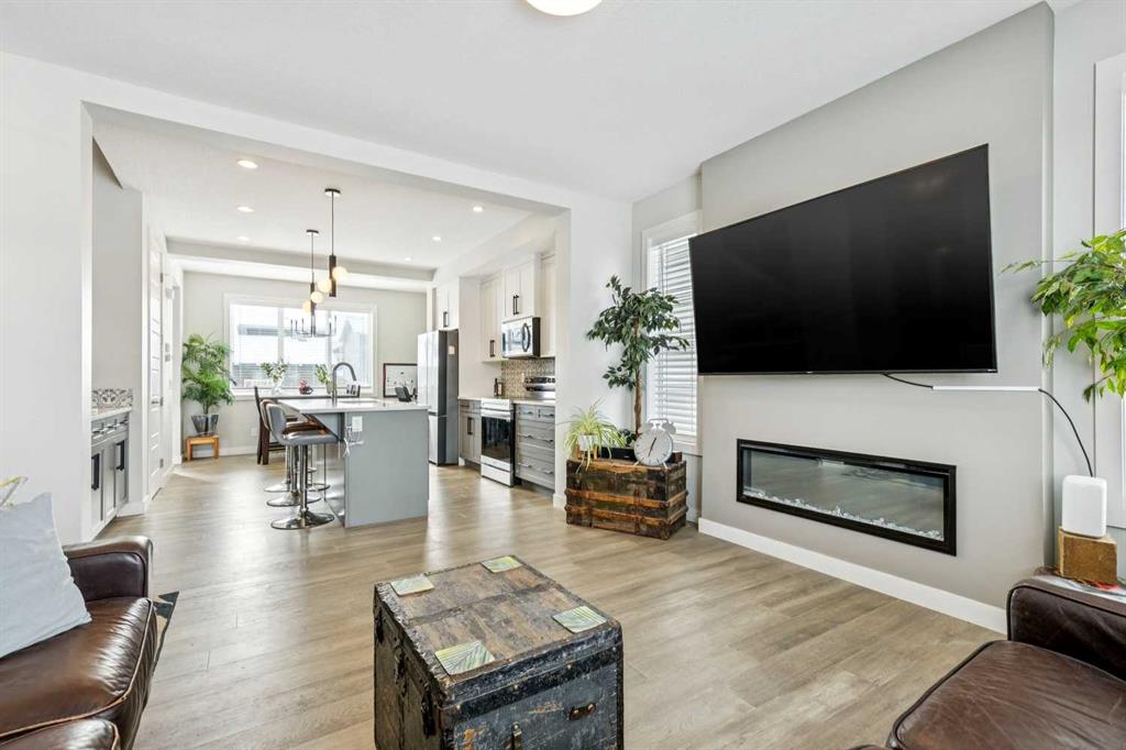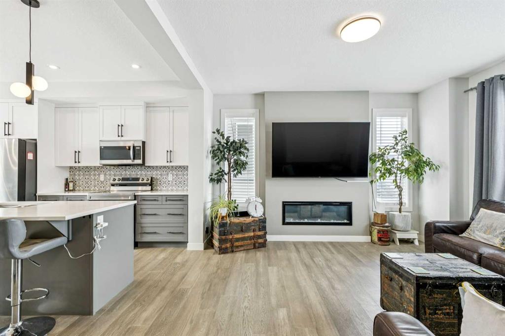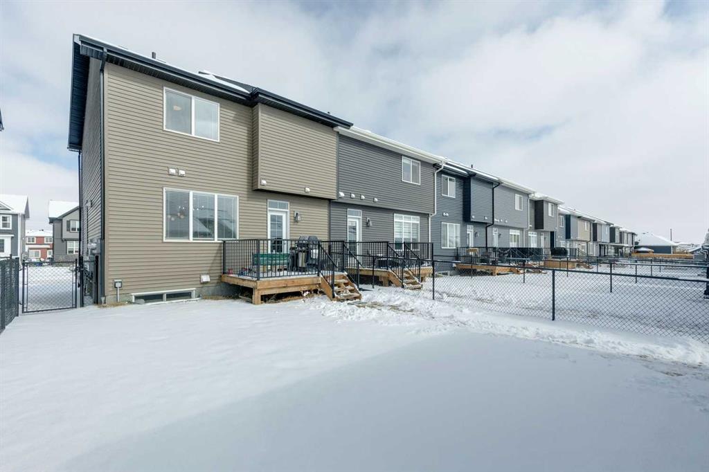 Welcome to this beautifully maintained 2 year old END UNIT townhome in the vibrant community of Chestermere, offering over 1,400 sq ft of developed living space above grade and exceptional value for buyers seeking modern comfort and functionality. The open concept main floor features engineered hardwood flooring and a bright, inviting living room complete with a cozy fireplace perfect for relaxing or entertaining. The modern kitchen showcases upgraded appliances above builder grade finishes, along with a convenient eat-up bar and a dedicated coffee area, creating the ideal space for casual dining and morning routines. A half bath completes the main level. Upstairs, you’ll find three spacious bedrooms, including a primary retreat with a private 4 piece ensuite. The second bedroom also features its own 4 piece ensuite, making it perfect for guests, family members, or roommates. The upper-floor laundry with full size washer and dryer adds everyday convenience right where you need it. The undeveloped basement offers a blank canvas for future development to suit your lifestyle. Outside, enjoy a fully landscaped and fenced yard, along with a detached double car garage providing both privacy and practicality. As an end unit, this home offers additional natural light, extra privacy, and enhanced curb appeal. Located just minutes from Chestermere Lake, parks, schools, and local amenities, this nearly new townhome delivers an outstanding combination of style, space, and value. An exceptional opportunity to own a modern home in one of Chestermere’s most desirable and growing communities.