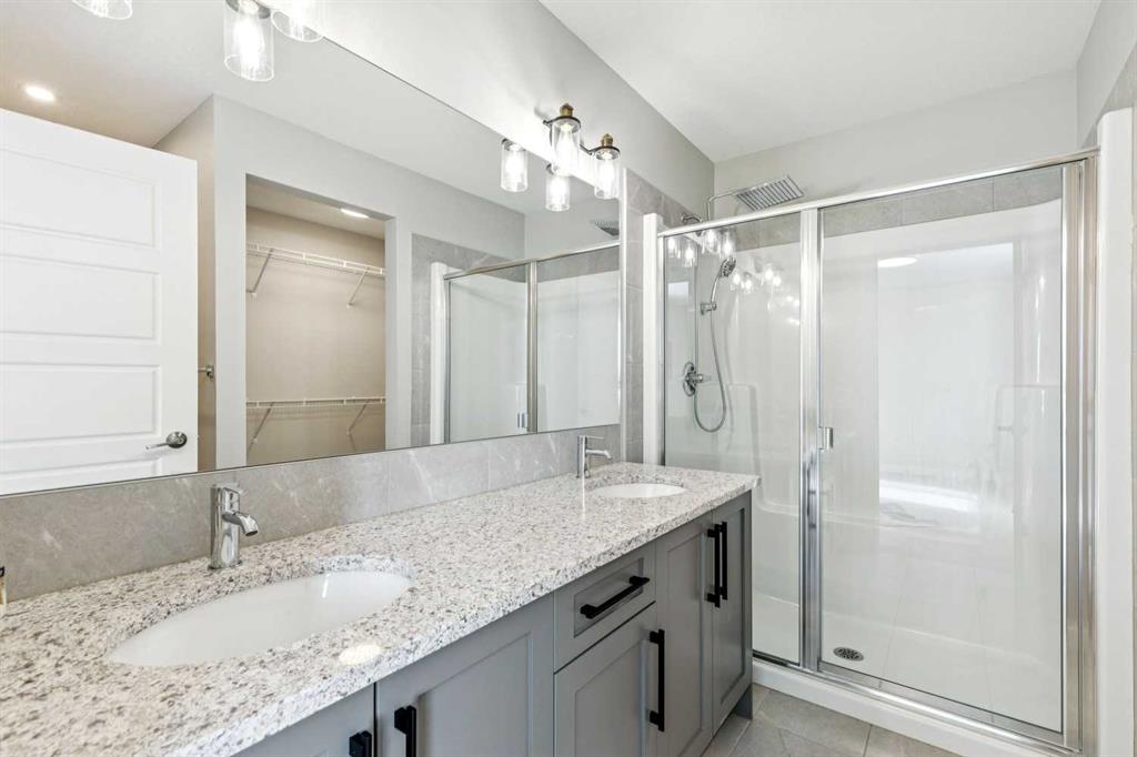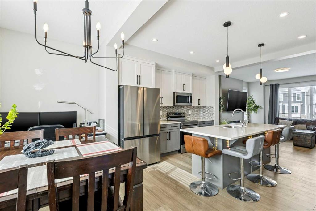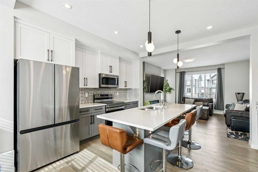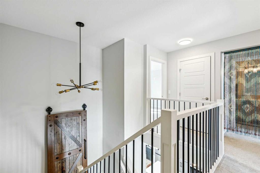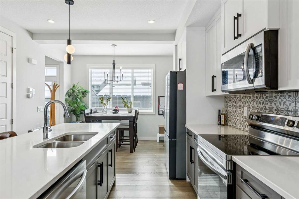 Welcome to this beautifully maintained 2 year old END UNIT townhome in the vibrant community of Chestermere, offering over 1,400 sq ft of developed living space above grade and exceptional value for buyers seeking modern comfort and functionality. The open concept main floor features engineered hardwood flooring and a bright, inviting living room complete with a cozy fireplace perfect for relaxing or entertaining. The modern kitchen showcases upgraded appliances above builder grade finishes, along with a convenient eat-up bar and a dedicated coffee area, creating the ideal space for casual dining and morning routines. A half bath completes the main level. Upstairs, you’ll find three spacious bedrooms, including a primary retreat with a private 4 piece ensuite. The second bedroom also features its own 4 piece ensuite, making it perfect for guests, family members, or roommates. The upper-floor laundry with full size washer and dryer adds everyday convenience right where you need it. The undeveloped basement offers a blank canvas for future development to suit your lifestyle. Outside, enjoy a fully landscaped and fenced yard, along with a detached double car garage providing both privacy and practicality. As an end unit, this home offers additional natural light, extra privacy, and enhanced curb appeal. Located just minutes from Chestermere Lake, parks, schools, and local amenities, this nearly new townhome delivers an outstanding combination of style, space, and value. An exceptional opportunity to own a modern home in one of Chestermere’s most desirable and growing communities.