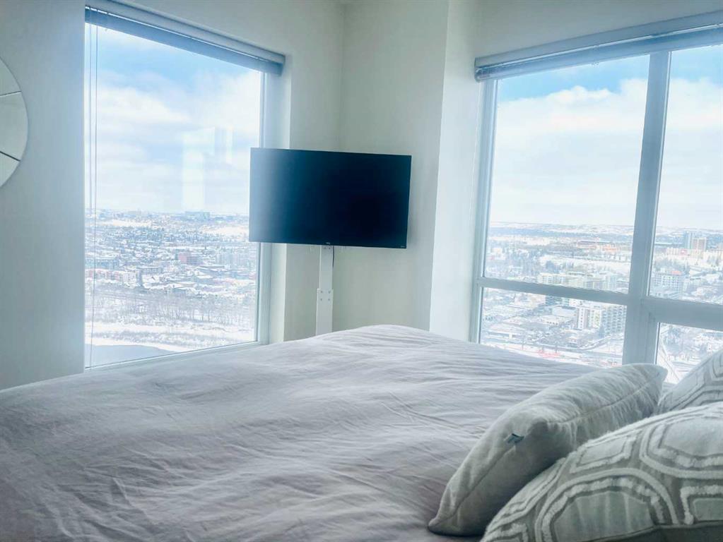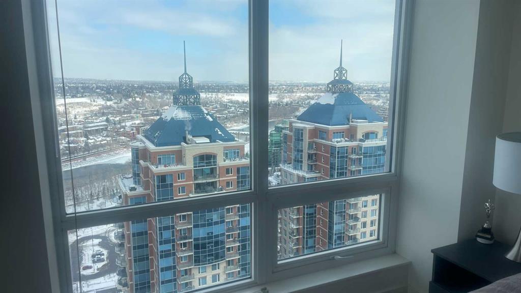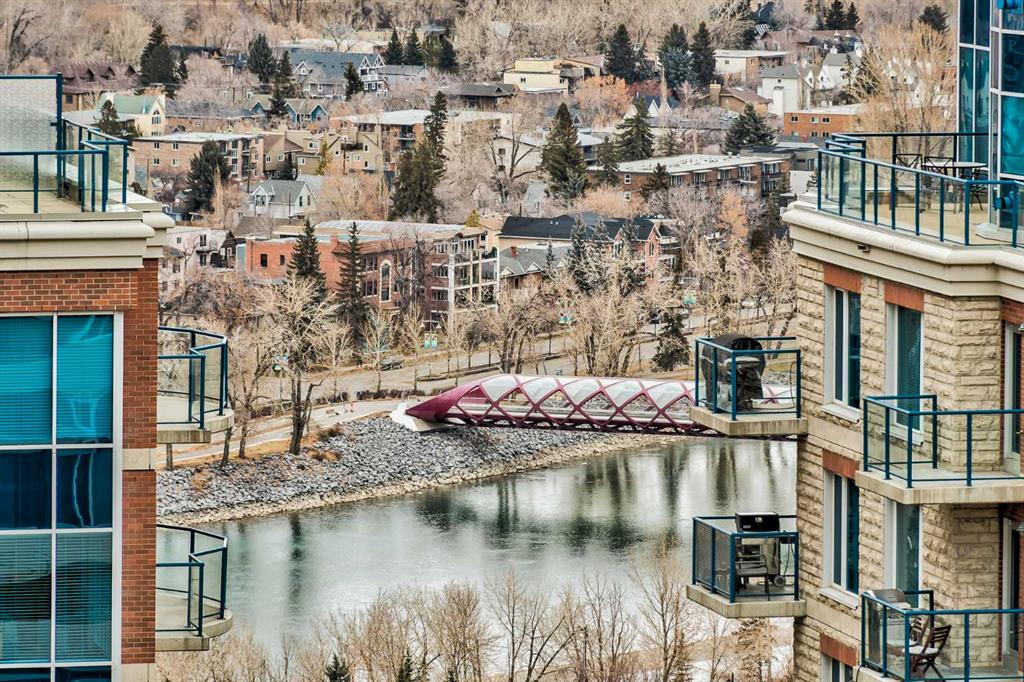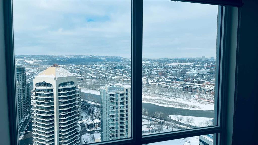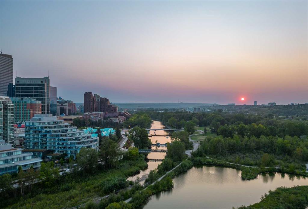 Experience luxury living high above Calgary in this premier NW corner suite on the 32nd floor, offering 1,017 sq.ft. of beautifully designed space with 2 bedrooms, 2 bathrooms + den. High ceilings and oversized windows bring the outside in, filling the home with natural light and framing spectacular 180° unobstructed views of the Bow River, Rocky Mountains, Kensington, downtown, and even the airport. This rare floorplan is one of only three units of its kind in the building, making it an exceptional opportunity. The open-concept layout is ideal for both living and entertaining, featuring stunning stainless steel appliances, quartz countertops, and large amounts of storage. The primary suite is a private retreat with a luxurious ensuite, while the second bedroom and full bath provide flexibility for family, guests, or a home office. Step outside onto two private balconies, one with a gas line for BBQ, perfect for morning coffee, sunset views, or entertaining guests. Move-in ready with luxury finishes throughout. Additional conveniences include a large premium parking stall on the first level beside the elevator, secure visitor parking, and dedicated bike storage. Residents enjoy the prestige of concierge services and all the amenities of downtown living. Ideally located just steps from Prince's Island Park, the cafés and boutiques of Kensington, the dining and nightlife along 17th Avenue SW, and the vibrant energy of Eau Claire. River pathways, parks, restaurants, and shopping are all within easy reach. Rare, luxurious, and move-in ready — this is downtown Calgary living at its finest.