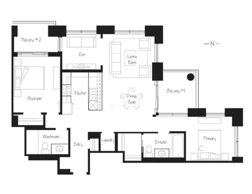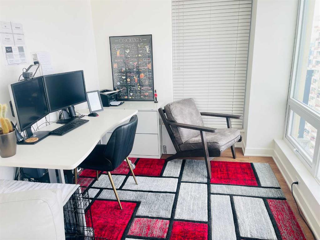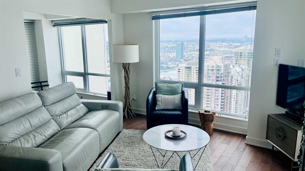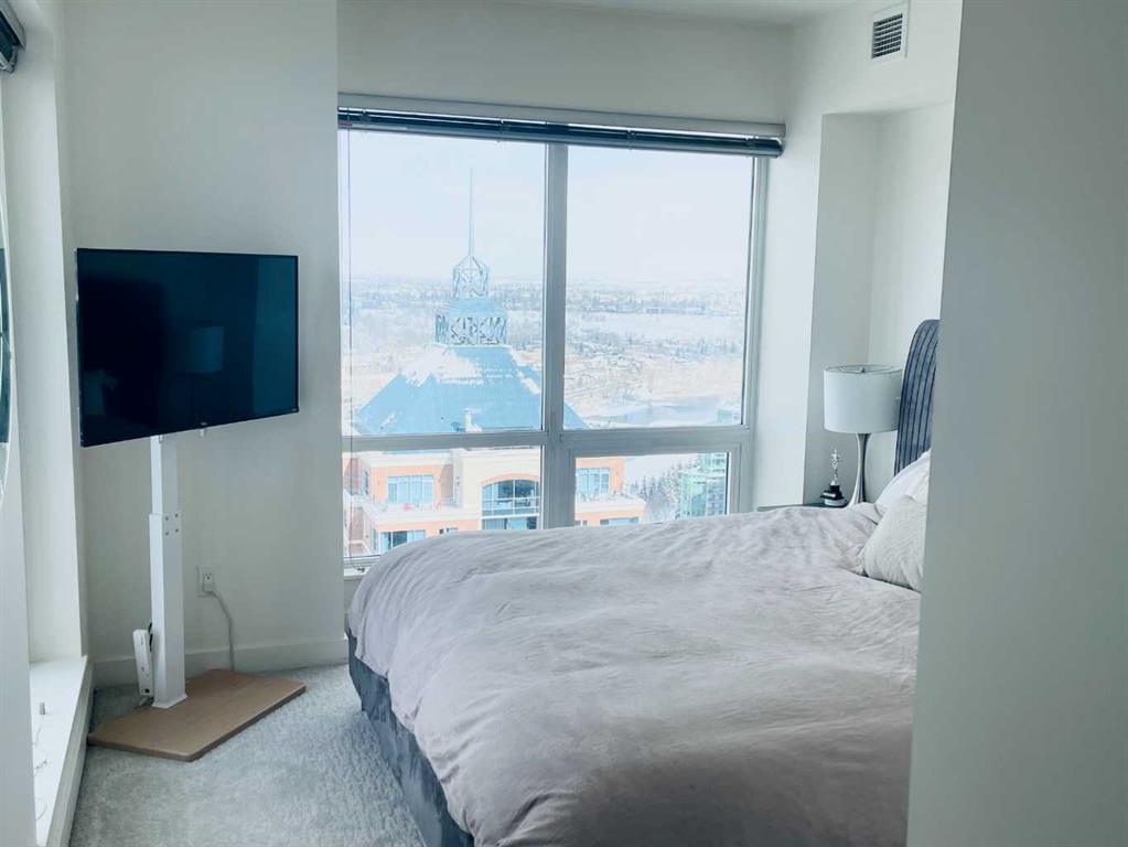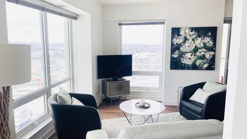 Experience luxury living high above Calgary in this premier NW corner suite on the 32nd floor, offering 1,017 sq.ft. of beautifully designed space with 2 bedrooms, 2 bathrooms + den. High ceilings and oversized windows bring the outside in, filling the home with natural light and framing spectacular 180° unobstructed views of the Bow River, Rocky Mountains, Kensington, downtown, and even the airport. This rare floorplan is one of only three units of its kind in the building, making it an exceptional opportunity. The open-concept layout is ideal for both living and entertaining, featuring stunning stainless steel appliances, quartz countertops, and large amounts of storage. The primary suite is a private retreat with a luxurious ensuite, while the second bedroom and full bath provide flexibility for family, guests, or a home office. Step outside onto two private balconies, one with a gas line for BBQ, perfect for morning coffee, sunset views, or entertaining guests. Move-in ready with luxury finishes throughout. Additional conveniences include a large premium parking stall on the first level beside the elevator, secure visitor parking, and dedicated bike storage. Residents enjoy the prestige of concierge services and all the amenities of downtown living. Ideally located just steps from Prince's Island Park, the cafés and boutiques of Kensington, the dining and nightlife along 17th Avenue SW, and the vibrant energy of Eau Claire. River pathways, parks, restaurants, and shopping are all within easy reach. Rare, luxurious, and move-in ready — this is downtown Calgary living at its finest.