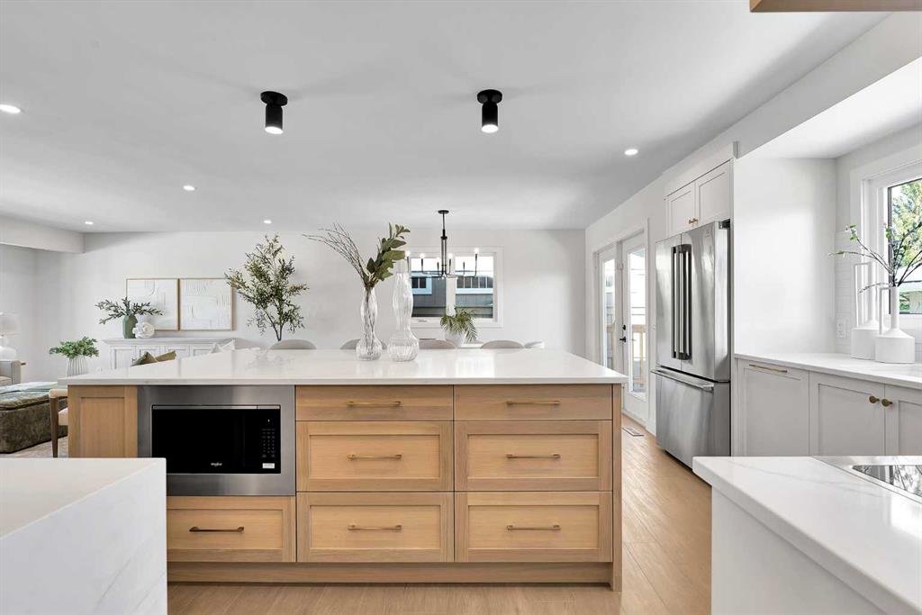 The more you look, the more you’ll fall in love with this exquisite Lake Bonavista home. The four-level split has been fully renovated with style and stellar attention to detail. Live the lake community life, two blocks from the beach and backing onto green space. An upgraded exterior has a high-end look with new stonework, windows, and doors. Inside, natural light floods a stunning main floor through full-height living room windows, while wide-plank floors anchor the airy aesthetic, connecting the open layout as you move into the custom kitchen. A massive eat- up island with hidden storage is the heart of the space. Quartz counters and subway tile backsplashes pair with white oak shelving, black hardware, and a waterfall beverage bar in perfect minimalist elegance. High-end appliances include an induction range, French door refrigerator, beverage cooler, and a custom panel dishwasher. Integrated cabinets and drawers for pantry items, recycling, spices and utensils add curated function. In the sunny dining area, glass-paned doors seamlessly transition to the outdoor living space. A mudroom with custom built-ins completes this level. Upstairs, the primary bedroom is decadent and serene. The ensuite offers dual sinks, built-in features, upscale finishes, and a gorgeous tiled shower. The walk-in closet is also custom. Two more bedrooms share a beautiful main bathroom in a family- friendly layout. Custom millwork throughout the home adds a luxurious touch. A rare find; the lower levels are equally lovely. A sunken living room with high ceilings and big windows faces a cozy gas fireplace in a chic hearth. The hanging barn door reveals a quiet office and the laundry room, which has a quartz vanity and a new washer and dryer. Another full bath with a walk-in shower means this could be a self-contained guest area. In the basement, plush new carpet highlights comfort, and premium finishes continue. A rec area is ready for your home theatre or games zone, and there is fourth bedroom here. Built-in cupboards and a utility room provide plenty of seasonal storage. The home was remodeled from the studs out, and all plumbing and electrical, the panel and the hot water tank, have been upgraded. Outside, the deck overlooks a big southeast lawn edged by trees and foliage. The roof, soffits, and fascia are new, and the heated, oversized double-detached garage has also been updated, as has the fence along the paved alley. The home backs onto a treed, parklike corner of the school field near the garden program area. In walking distance, the community association offers a range of year-round activities, and the beach and tennis courts are also nearby. The Promenade at Lake Bonavista has groceries, shops, and restaurants available within a few blocks, and this community has several great schools and parks. Commuting and visiting are easy, using primary routes like Anderson Road and Deerfoot Trail, and Macleod Trail has a great selection of shopping and dining options. Call today.