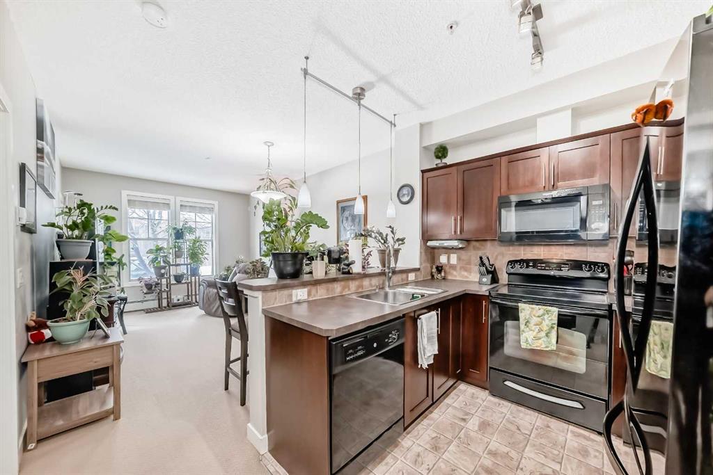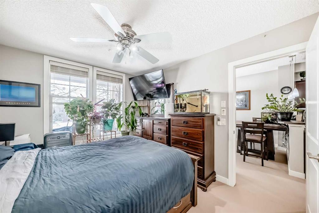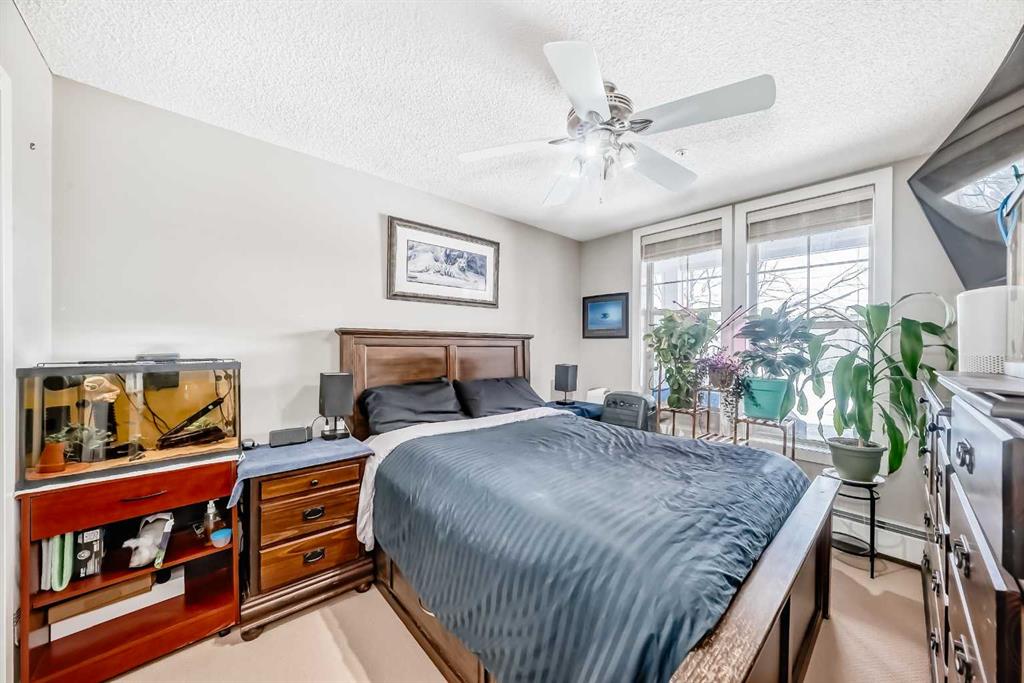 Welcome to this inviting southwest facing ground floor apartment in the sought-after community of Sunset Ridge. Offering a functional and comfortable layout, this home features updated appliances, a spacious primary bedroom with a walk-in closet, an office area, and the convenience of an in-suite laundry room. Step outside to your private southwest-facing patio, the perfect place to relax and enjoy beautiful mountain views, complete with a BBQ gas line for easy outdoor grilling and entertaining. There is a titled parking stall and a dedicated storage unit in the underground heated parking garage. Residents have access to excellent building amenities including a fitness centre, secure bike storage, and a guest suite available to rent for visiting friends and family. Ideally located just steps from a convenient commercial plaza featuring a gas station, convenience store, restaurants, bakery, pharmacy, liquor store, and hair salon, making everyday errands effortless. Surrounded by pathways, parks, and stunning Rocky Mountain views, this home offers comfortable, low-maintenance living.