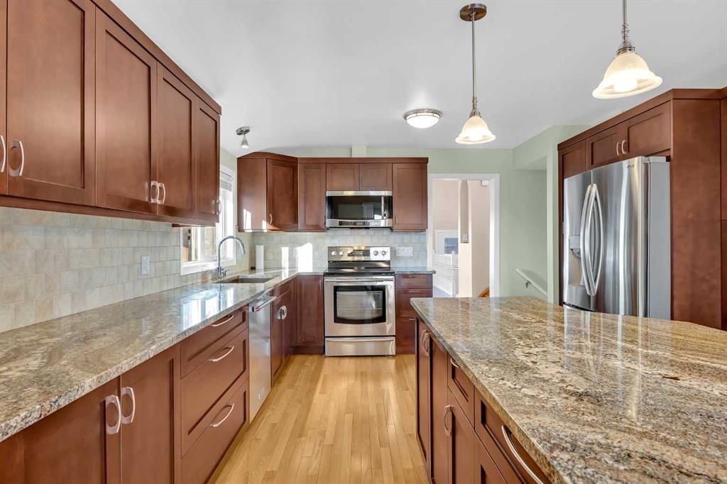 Back on the market. This spacious 4-level split home in the desirable community of Cedarbrae, offering just about 1,000 sq ft on the main floor and a functional layout perfect for families. The beautifully renovated kitchen features quartz countertops, a large island with breakfast bar, and new stainless steel appliances, creating a bright and modern space for cooking and entertaining. New double doors open to the east-facing balcony, bringing in plenty of natural light. The massive primary bedroom includes a huge closet, while the second bedroom features a built-in computer desk, ideal for working or studying from home. The upper level also offers a newly renovated 3-piece bathroom. The lower level includes a cozy wood-burning fireplace with gas lighter, a wet bar, and large basement bedrooms, providing great additional living space. The laundry room is equipped with a convenient laundry sink, and the furnace room includes a huge crawl space for extra storage and a water softener. High efficiency furnace in great condition and the hot water tank installed in September 2024. Step outside to a private backyard with mature aspens, fruit trees, and a storage shed, creating a peaceful outdoor retreat. Located in the well-established Cedabrae community, close to parks, schools, and amenities, this home offers comfort, space, and excellent value.
