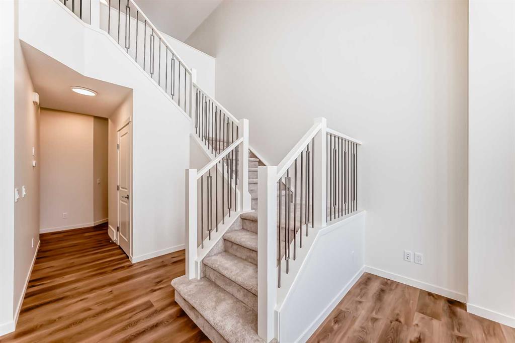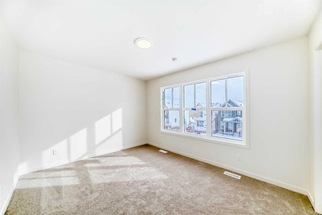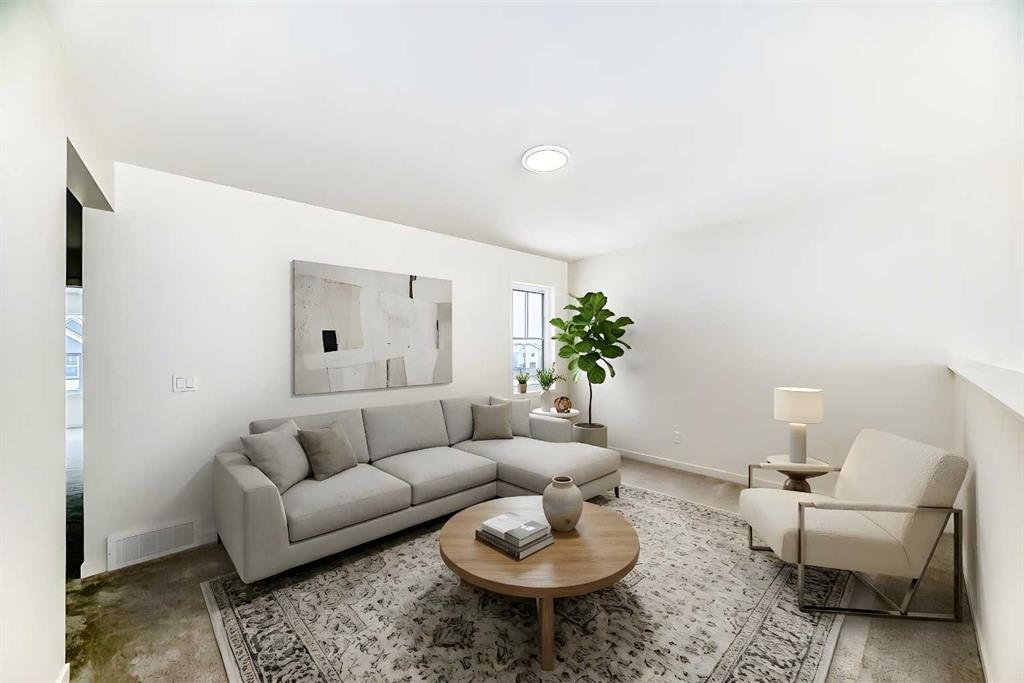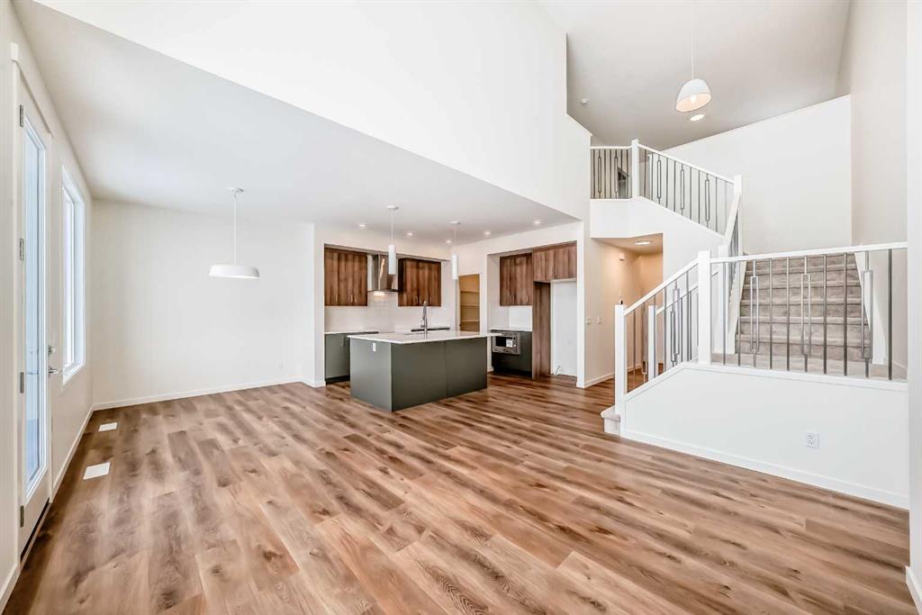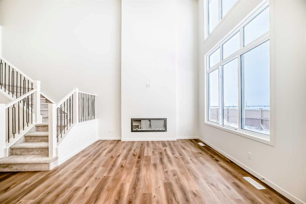 Welcome to the “Grada” by Hopewell Residential, where elevated design and everyday functionality come together in Calgary’s visionary garden-to-table community of Rangeview. Offering 2,119 sq. ft., 4 total bedrooms, and a thoughtfully designed layout that balances style with practicality, this is a home that feels as good as it looks. From the moment you step inside, you’ll appreciate how well this home is designed for modern family living. Just off the front entry, a main floor bedroom is paired with a convenient 3-piece bathroom, creating exceptional flexibility for a variety of lifestyles. Whether used for multi-generational living, a live-in nanny, overnight guests, or even as a private home office, this space adds versatility that is increasingly hard to find. As you move further into the home, the main floor opens beautifully into a spacious dining area and inviting lifestyle room, creating an effortless flow for both everyday routines and entertaining. The open-to-above living room creates a dramatic sense of space, while floor-to-ceiling windows flood the home with natural light. A beautiful fireplace anchors the room, adding warmth and character to this impressive central gathering space. The kitchen is a true standout, blending contemporary style with timeless finishes. Designed to impress, it features quartz countertops, a large central island, built-in microwave, upgraded storage drawers, and a striking stand-alone hood fan wrapped in a classic white 4x4 backsplash that adds texture and charm. The two-tone cabinetry offers a designer look with modern green lower cabinets paired with wood grain upper cabinetry, creating a warm and sophisticated aesthetic that sets this home apart. Upstairs, the thoughtful layout continues with a central bonus room overlooking the main living space below and benefiting from the home’s oversized two-storey windows, which fill the upper level with light and create an airy, open feel. You’ll also find three spacious bedrooms, including a well-appointed primary retreat featuring a step-in shower for a spa-inspired feel. A full bathroom and conveniently located upper floor laundry. The lower level provides excellent future potential with a 9-foot foundation, giving you flexibility to expand your living space over time or explore the possibility of a secondary suite (a secondary suite would be subject to approval and permitting by the city/municipality). Located in Rangeview, one of Calgary’s most unique new southeast communities, this home offers more than just beautiful interior finishes—it offers a lifestyle rooted in connection, nature, and community. Designed around a garden-to-table vision, Rangeview brings residents together with thoughtfully planned green spaces, pathways, gathering areas, and a strong sense of belonging. It’s the perfect setting for families looking for a fresh start in a neighbourhood built with lifestyle in mind. Discover the perfect blend of comfort, style, and community with The Grada in Rangeview.