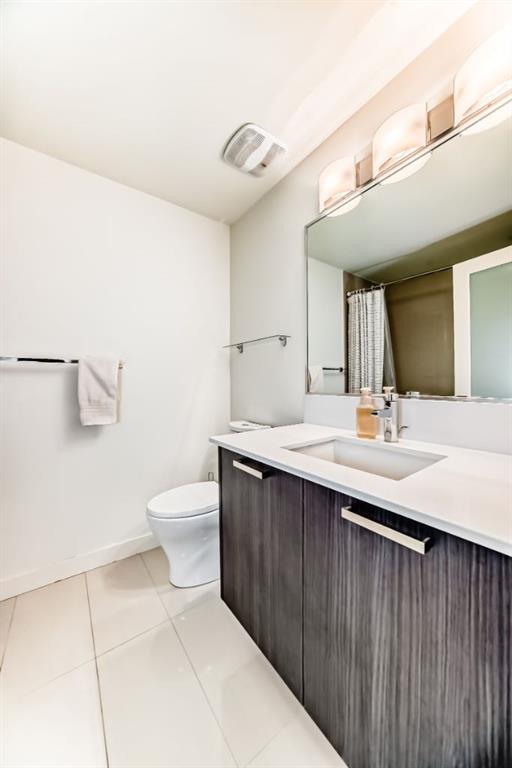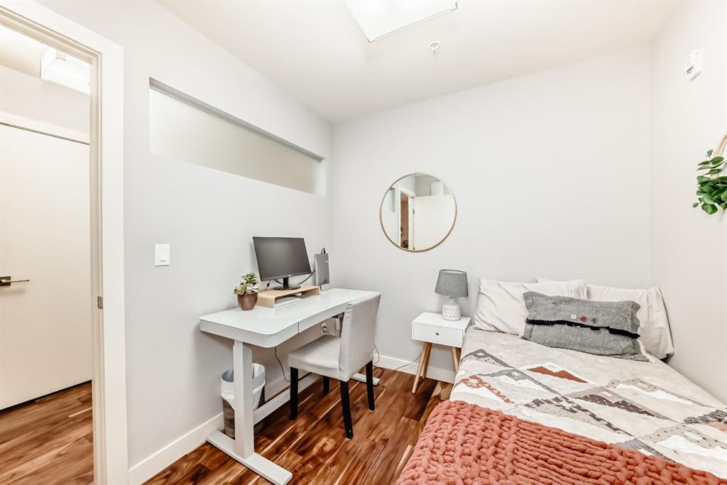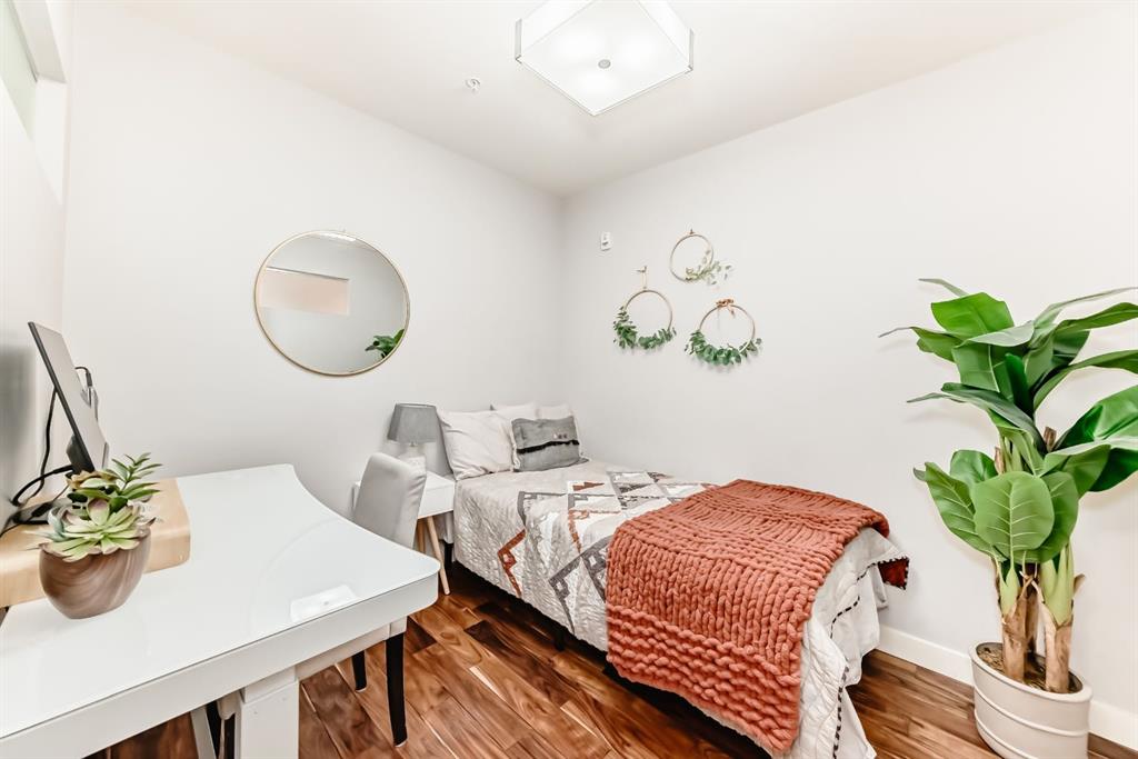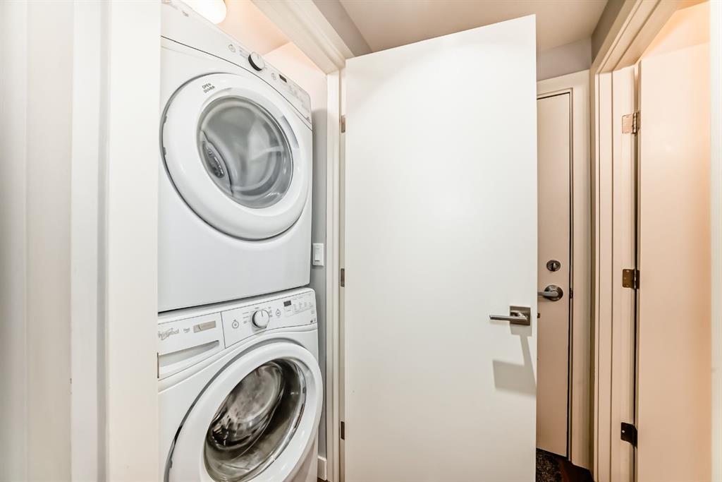 Excellent professional and or investor condo ((short term rentals allowed) in a prime area of Connaught/Beltline. Sunny south unit direction with air conditioning ($10000 option). Two bedroom, two full bathrooms (Ensuite and guest bathrooms), spacious living room, kitchen with dining, eating bar area, upgrade features include: quartz countertops, engineered hardwood flooring, spacious open plan, 9 foot ceilings, in suite laundry, spacious deck, one rear lot parking stall, beside rear access door. Bedroom 2 fits a bed. No exterior window and closet is in hallway. Extra storage locker in parkade area Location is close to everything downtown: restaurants, coffee shops, etc. but location is still quiet at night - away from the noise of the nightlife.