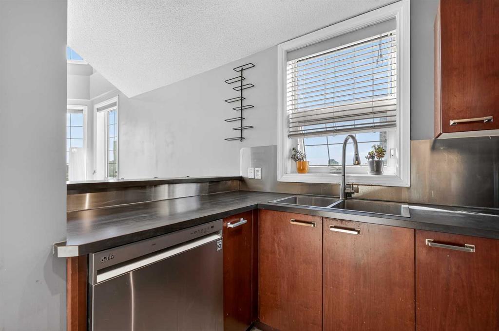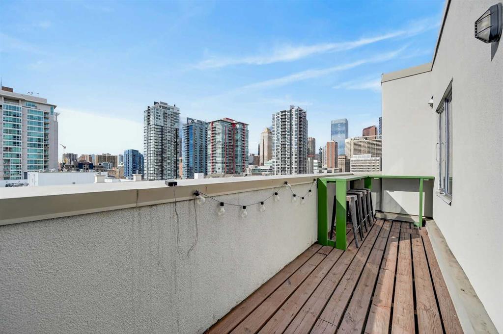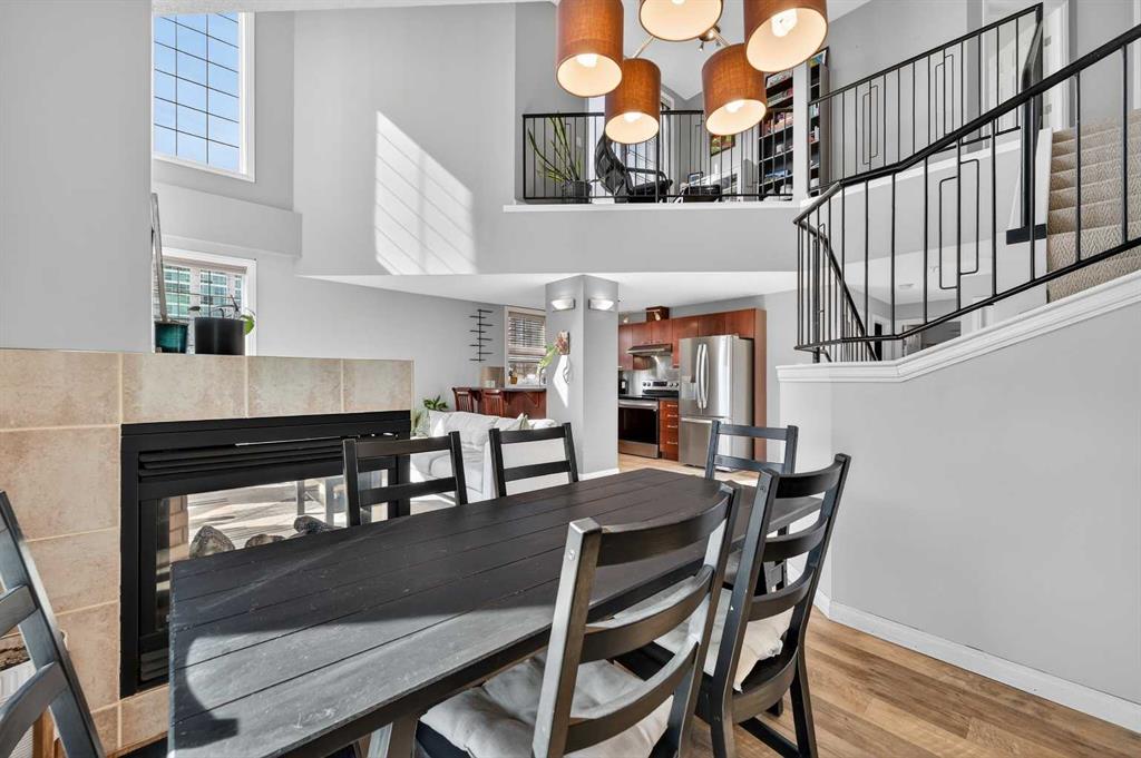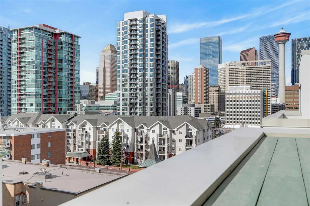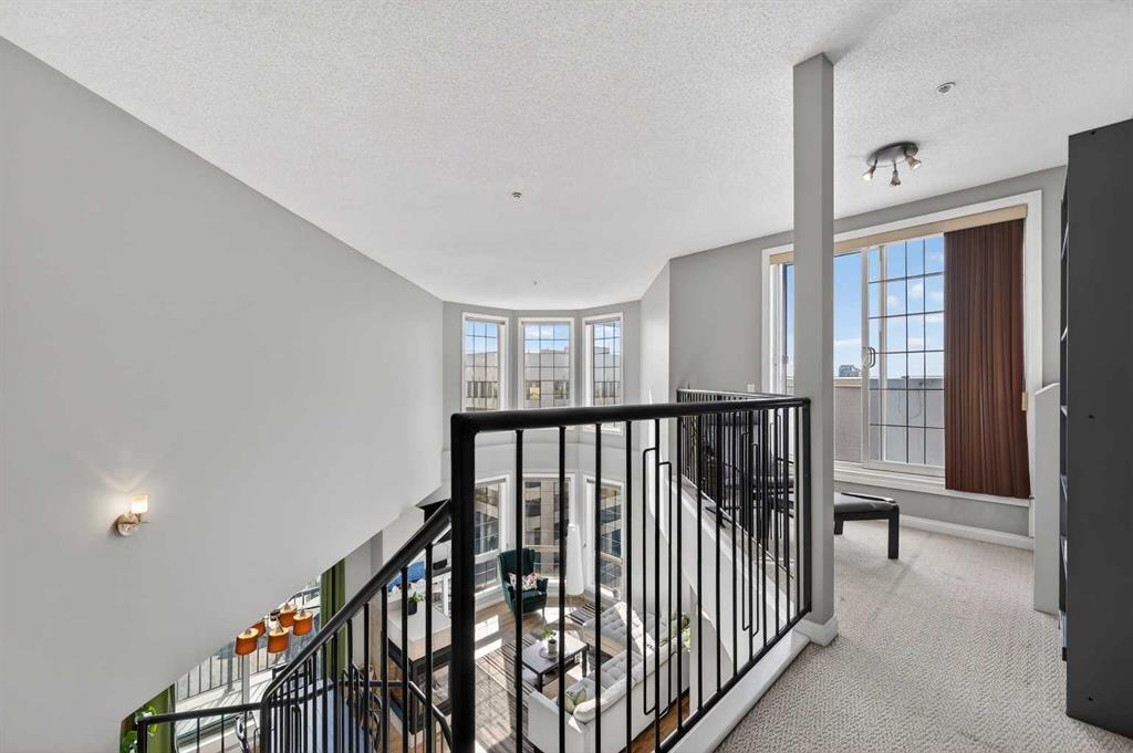 18-foot ceilings. Two outdoor spaces. Downtown views that don’t get old. This 2-storey penthouse stands out the moment you walk in. Two-storey windows and southwest exposure flood the living space with natural light, while views stretch across downtown to the north and west. Remote blinds add comfort and control throughout the day. The living room is anchored by those SW windows, with a 3-sided fireplace as the finishing touch—creating a space that feels both open and inviting. The kitchen features stainless steel appliances, dark-stained maple cabinetry, and a raised eating bar—perfect for entertaining or everyday living. The main floor also offers a spacious second bedroom with cheater access to a 4-piece bathroom—ideal for guests, roommates, or flexibility. Upstairs, the primary bedroom captures its own downtown views and includes a walk-in closet and 4-piece ensuite. A loft area just outside works perfectly as a home office or reading space, with access to your upper private deck complete with a raised bar—your second outdoor space to take in the city. A rare layout that truly lives differently—ideal for a first-time buyer, investor, or inner-city lifestyle. Underground parking keeps your vehicle secure year-round, and the location puts you just steps to downtown, 17th Avenue, transit (only 2 blocks to the train), and even walking distance to Flames games.