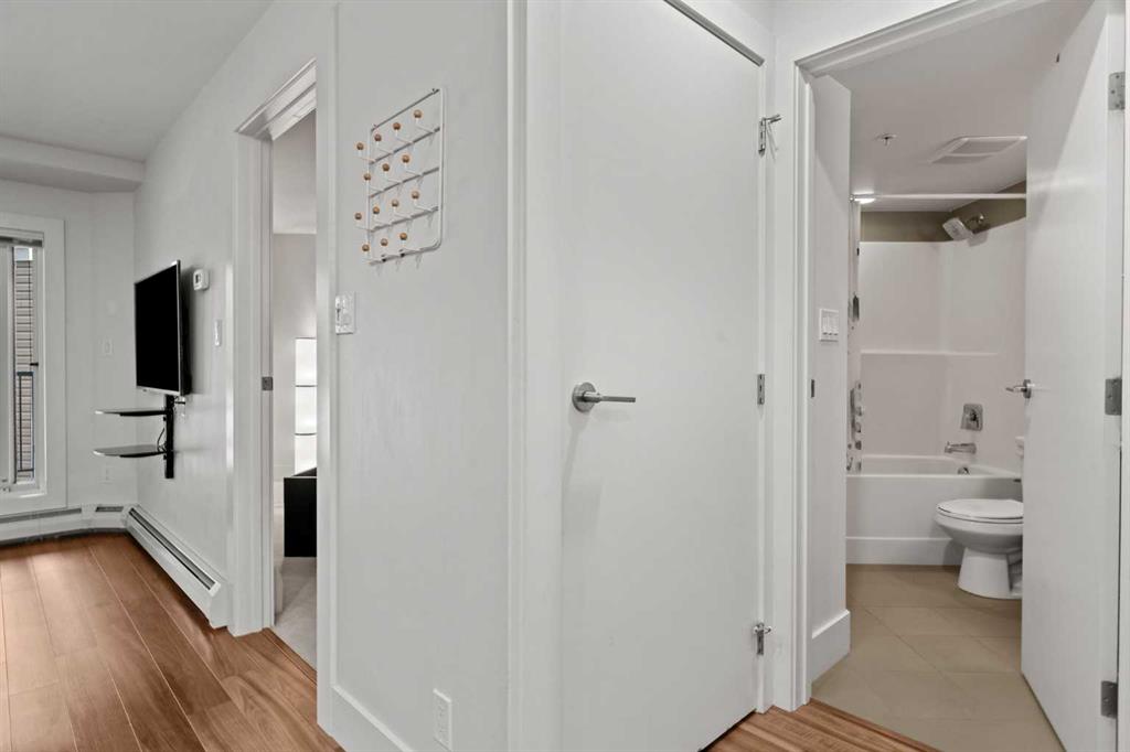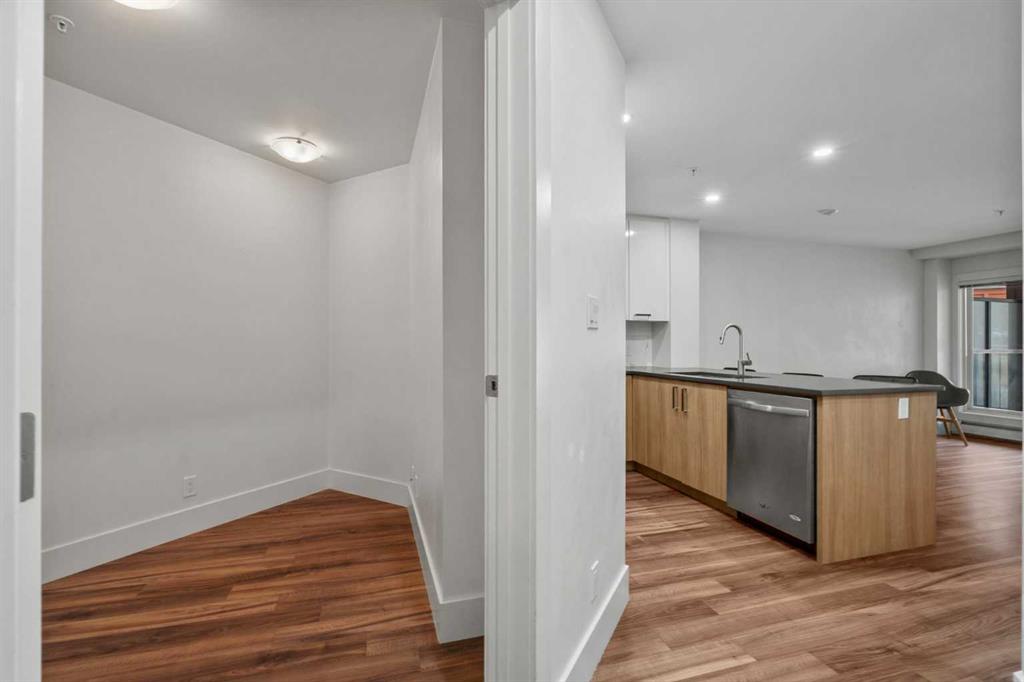 Come view this unique SECOND FLOOR UNIT, don’t let the #110 number deceive you, this beautiful second floor home backs onto a peaceful and quiet courtyard. Perfectly positioned in the heart of Bridgeland, where location, lifestyle, and smart design come together, this bright and modern 1-bedroom + DEN condo, perched above the main level, offers enhanced privacy and security beyond typical 100-level units. Built in 2016, this well designed home maximizes every inch of its nearly 600sf layout. The open concept living space features contemporary finishes, a sleek kitchen with STAINLESS STEEL APPLIANCES, a GAS RANGE, and modern cabinetry - perfect for both everyday living and entertaining. The VERSATILE DEN is ideal for a home office, additional storage, or a quiet reading nook. Enjoy your PRIVATE BALCONY overlooking the courtyard, creating the perfect setting for relaxing or unwinding in a quiet, peaceful atmosphere. Large windows fill the space with natural light, while the spacious bedroom, full bathroom, and IN-SUITE LAUNDRY add to the home’s overall comfort and convenience. Additional features include TITLED UNDERGROUND PARKING and a STORAGE LOCKER, along with access to building amenities such as a FITNESS CENTRE and DEDICATED BIKE STORAGE, providing both convenience and an active lifestyle. With it's location in one of Calgary’s popular inner-city communities, you’re just steps away from trendy cafés, restaurants, parks, river pathways, and the LRT, making commuting downtown or enjoying weekend outings effortless. Whether you're a first-time buyer, investor, or looking to downsize, this is an exceptional opportunity in a great location within a well managed building with LOW CONDO FEES.
