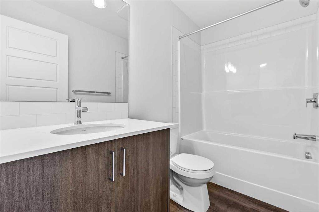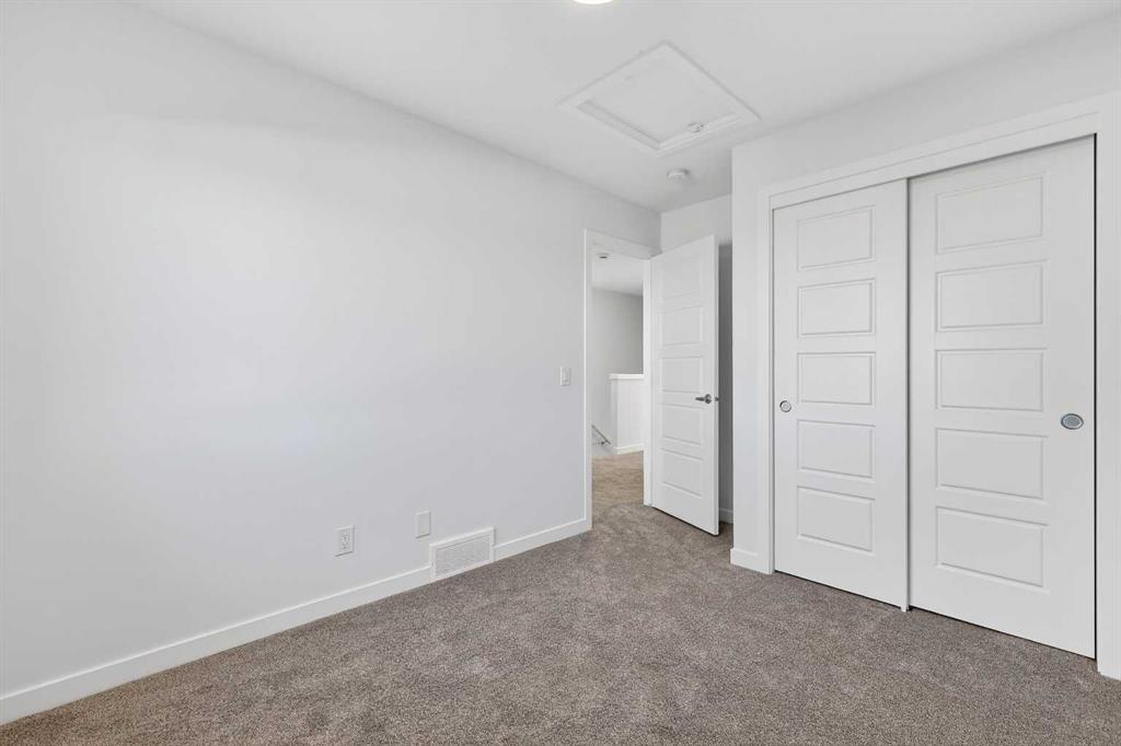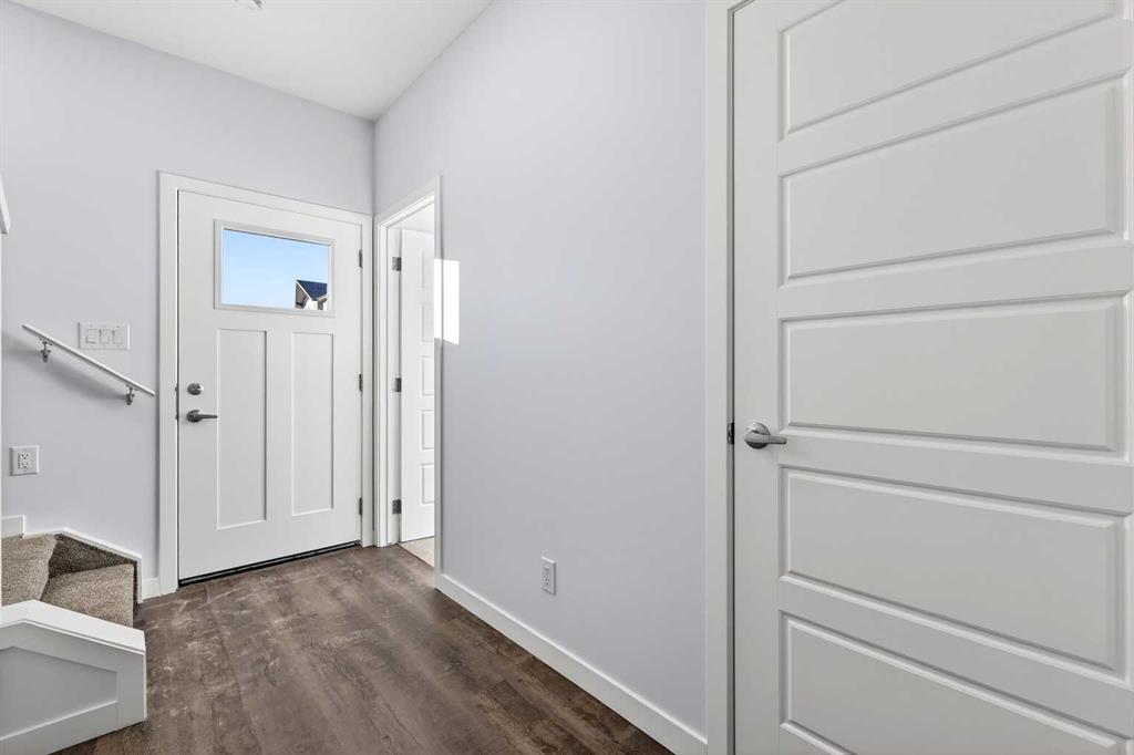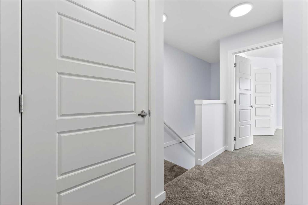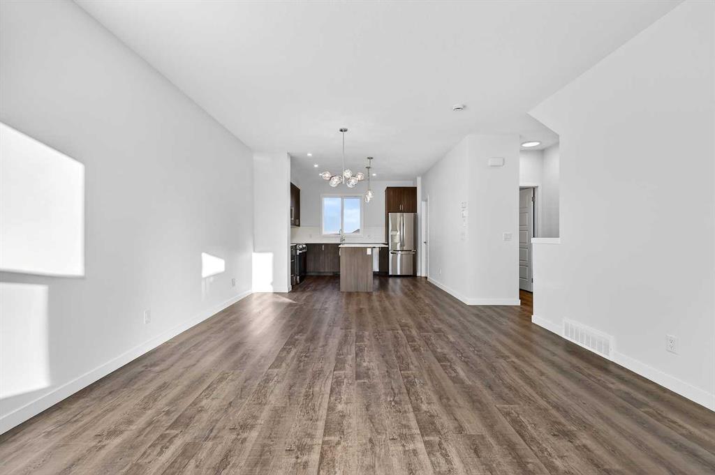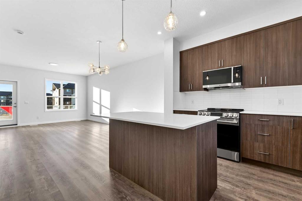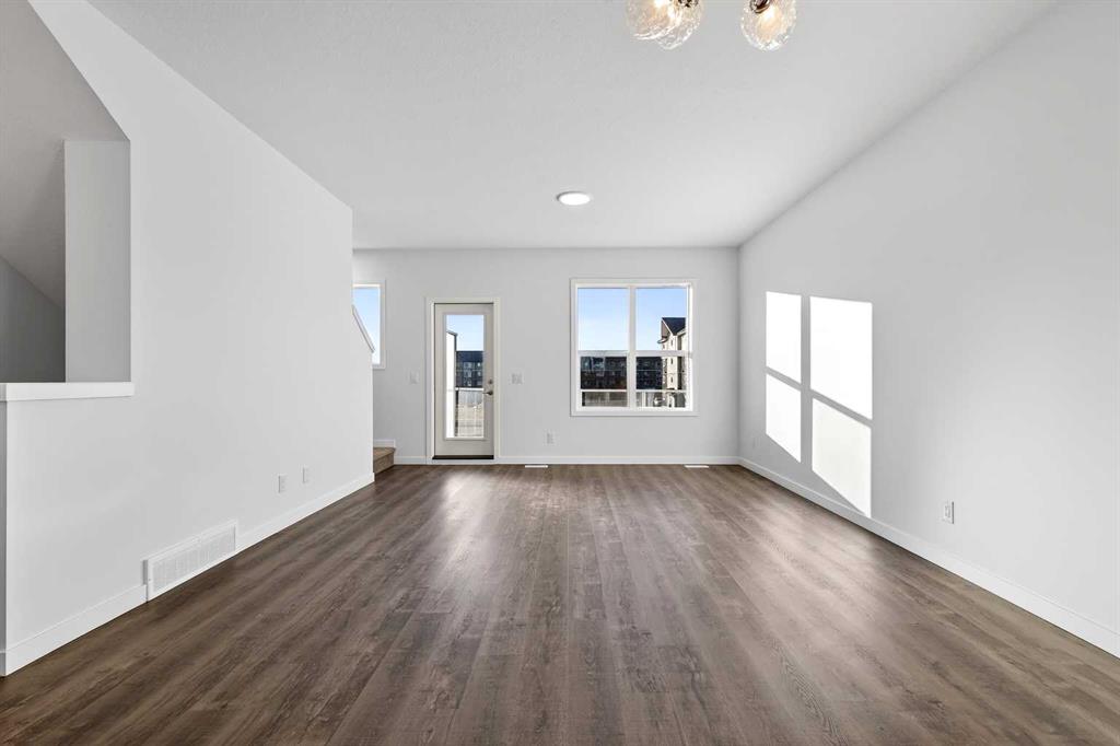 StreetSide proudly presents this exceptionally popular interior-unit townhome, where expansive living areas meet modern comforts and sophisticated finishes. The thoughtfully designed floorplan features three spacious upper-level bedrooms and two and a half well appointed bathrooms, complemented by a versatile lower-level den perfect for a home office or quiet retreat. The heart of the home is an inviting open-concept main floor, anchored by a large gourmet kitchen featuring a functional breakfast bar for casual dining. This bright living space transitions seamlessly to a private balcony, offering a perfect setting for outdoor relaxation. The interior showcases high end craftsmanship, including modern dark slab-style cabinetry with a full bank of drawers for maximum storage. The kitchen is further elevated by polished white quartz countertops and a full suite of premium stainless steel appliances. Durable luxury vinyl flooring runs throughout the primary living areas, while the stairs and upper level are finished with plush carpet over an 8lb underlay for superior comfort. Additional conveniences include an attached double car garage, professionally maintained landscaping, and a lifestyle defined by maintenance free living. Located within Red Embers Point East, this home places you at the heart of the dynamic Redstone neighborhood. Enjoy the ease of a convenient location with quick access to major routes, including Stoney Trail, ensuring you are never far from the city's best. The community is strategically positioned near future commercial developments, promising shops, services, dining, and entertainment options just moments from your doorstep.