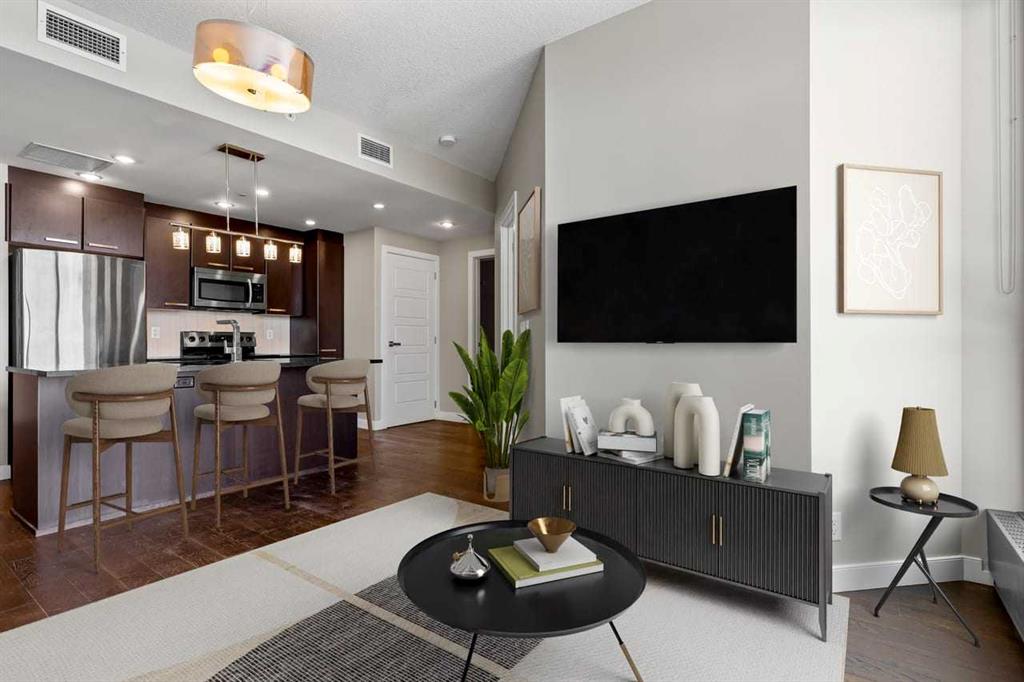 INVESTOR ALERT!!!! Great location, steps away from Stampede LRT, 17 Ave, Saddledome, Sunterra, Downtown and more. This is a low-maintenance unit, and it's been rented from day 1. Modern style open concept with large windows. Cozy unit with engineered hardwood floors, granite countertops and stainless steel appliances. Private access to Sunterra Market, great amenities with complete and high-end exercise machines and weights, hot tub, party room and guest suite. Underground parking and roof patio. Book your private showing.