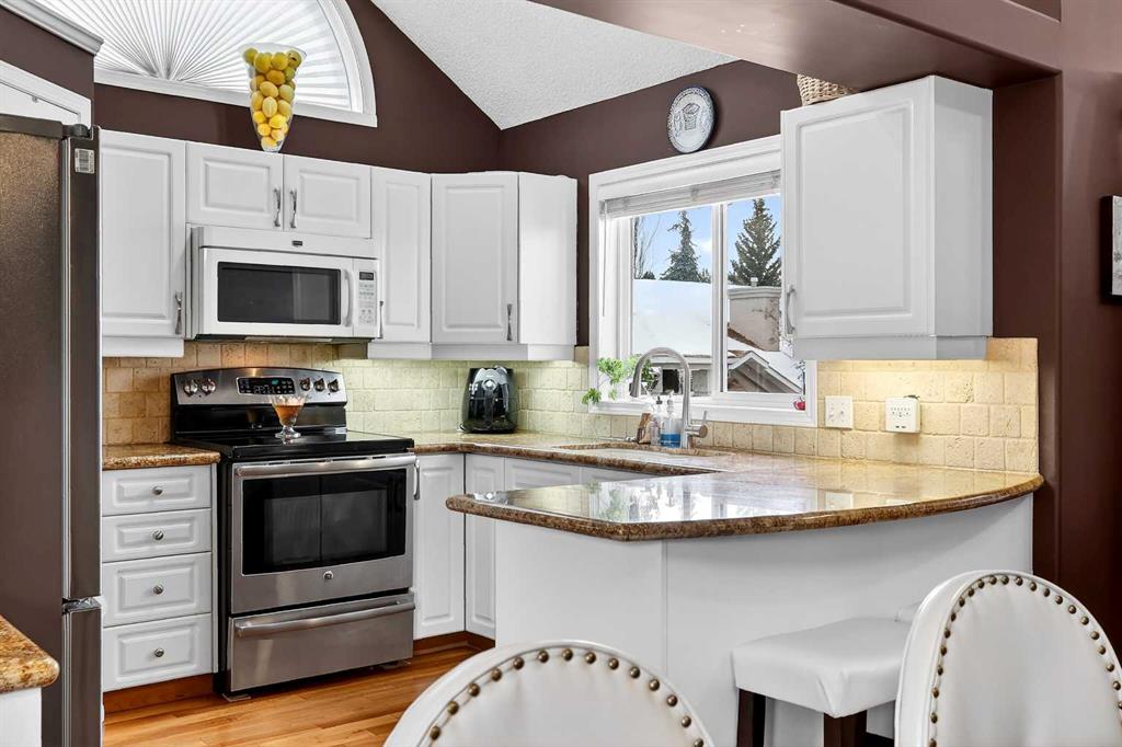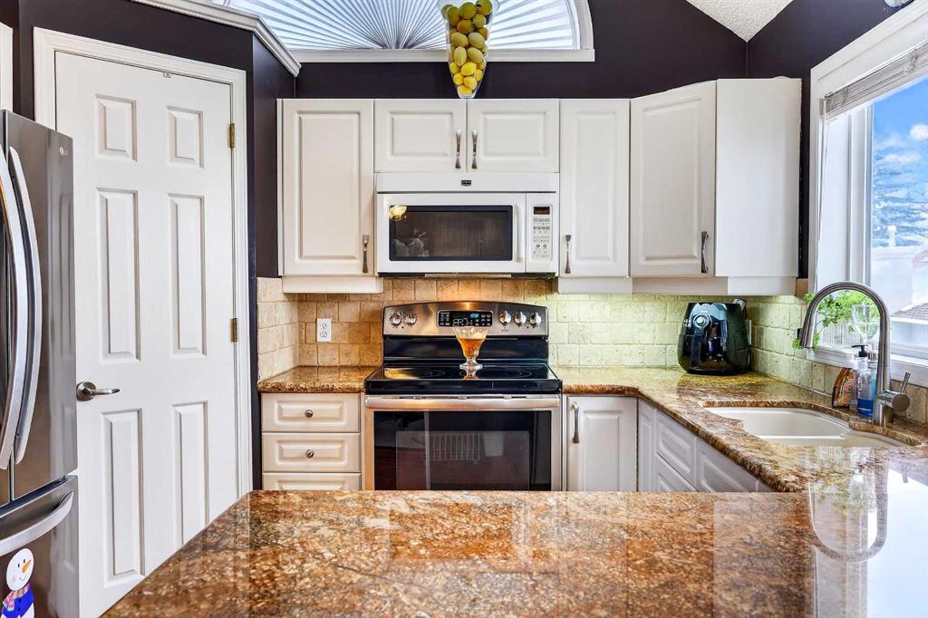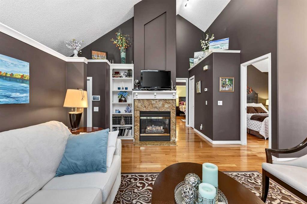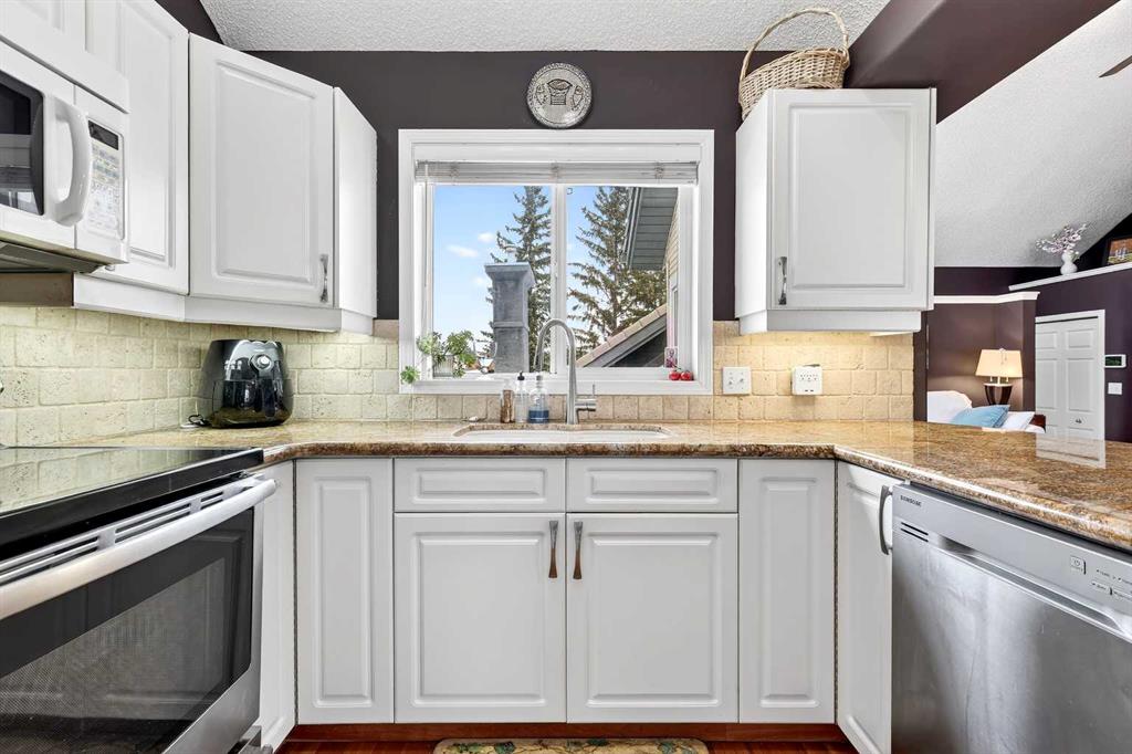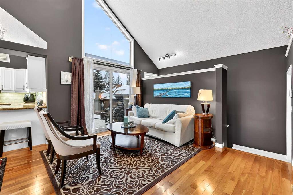 ***A Stunning Must See!*** Fantastic 2 bedroom, 2 bathroom end unit with attached (heated) garage in the highly desirable "Lookout at Christie Park!!" Enjoy unparalleled convenience that is merely a short walk to Sirocco LRT Station, Sunterra Market, shopping, a variety of restaurants, top-rated schools, parks and more. Icing on the cake is that it is a very quick commute to downtown...and an easy escape to the mountains from this coveted location! The unit itself offers over 1000 square feet developed with an amazing layout and soaring vaulted ceilings. A huge benefit is that no-one lives above...or below you! Updated flooring is comprised of cherry hardwood and luxury vinyl plank. Other items of note are granite kitchen countertops, a breakfast bar, clean/white cabinetry, stainless steel appliances and a feature gas fireplace in living room with granite facing. You'll absolutely LOVE the spacious bedrooms! The primary bedroom has a walk-in closet...plus 4 piece private ensuite. The 2nd bedroom has built-in cabinetry and is conveniently located near the main 3 piece bathroom. Dining area also has attractive built-in cabinetry. Main floor laundry too! ALL appliances included. The private west-facing balcony will bring peaceful enjoyment during the warm summer days/evenings. The Lookout is very well maintained with mature trees, visitor parking and near walking pathways. Units of this caliber rarely become available at such an affordable price. Don't miss out...call your favorite agent and come take a look!