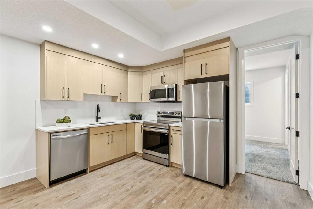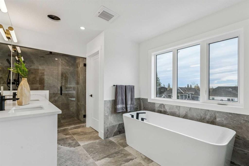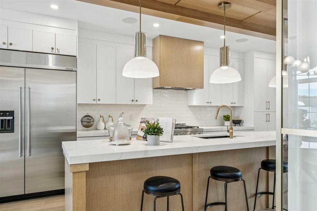 Elevated design and exceptional craftsmanship define this brand new 3-storey home offering over 3,700 sq ft of developed living space, complete with a legal basement suite, in a prime location just steps from Marda Loop amenities and only two blocks from the community centre and park. GREAT CITY VIEWS The open-concept main floor is designed for both everyday living and entertaining, with built-in speakers enhancing the atmosphere throughout. Oversized front windows flood the dining area with natural light, while designer lighting and a striking feature wall add a refined touch. The chef’s kitchen inspires culinary creativity with upgraded stainless steel appliances, a gas stove, full-height two-toned cabinetry, quartz countertops, a built-in bar area, and a large central island that invites connection. Full-height glass doors open to a main floor den, offering a bright and private workspace. The living room is anchored by a gas fireplace with floor-to-ceiling tile, while an entire wall of glass brings in south-facing sunshine and creates seamless indoor-outdoor flow to the rear deck. Upstairs, the primary retreat offers comfort and sophistication with oversized windows, a feature wall, a custom walk-in closet, and a luxurious 5-piece ensuite with dual sinks, a deep soaker tub, and an oversized multi-head rain shower. Two additional bedrooms, a 4-piece bathroom, and a conveniently located laundry room complete this level. The third floor expands the living space with incredible downtown views and flexibility for an additional primary retreat or an elevated bonus room. Enjoy a private balcony, wet bar with beverage fridge and dishwasher, and a lavish 5-piece bathroom—creating the perfect setting for both relaxing and entertaining against a stunning city backdrop. The legal basement suite provides excellent flexibility for multi-generational living or rental income. It features a private entrance, open layout, durable LVP flooring, a full kitchen with stainless steel appliances, dining space, two bedrooms, a 4-piece bathroom, and in-suite laundry. Outdoor living includes a full-width rear deck and a fenced yard for kids and pets, along with a double detached garage for added convenience. Contemporary curb appeal shines through with a refined mix of Hardie board siding, panel cladding, and brick accents. Located just two blocks from the Marda Loop community centre and park, enjoy access to an outdoor pool, beach volleyball courts, tennis and pickleball courts, playgrounds, and green space. Just steps away, explore vibrant cafés, restaurants, boutique shopping, seasonal markets, and nearby schools—offering an exceptional walkable lifestyle. Luxury, flexibility, incredible views, and an unbeatable location come together in this thoughtfully designed home.