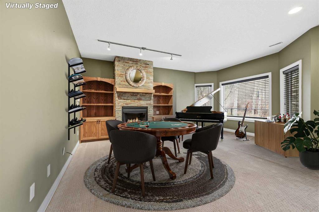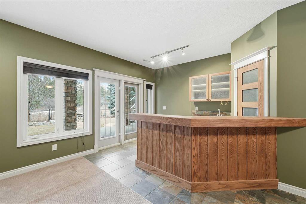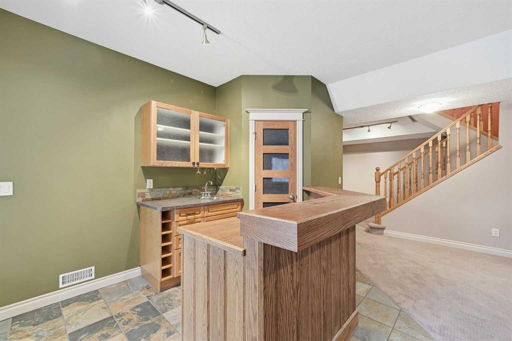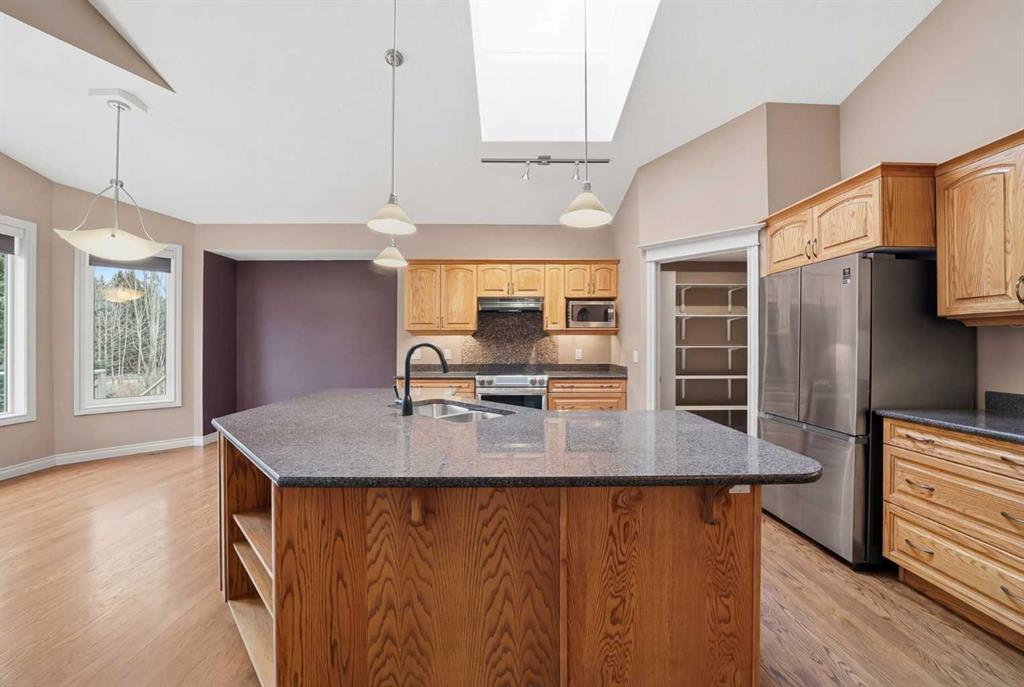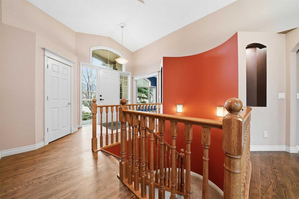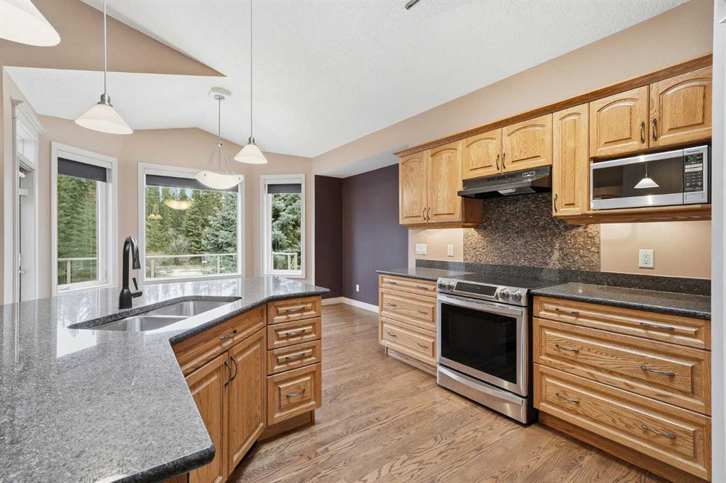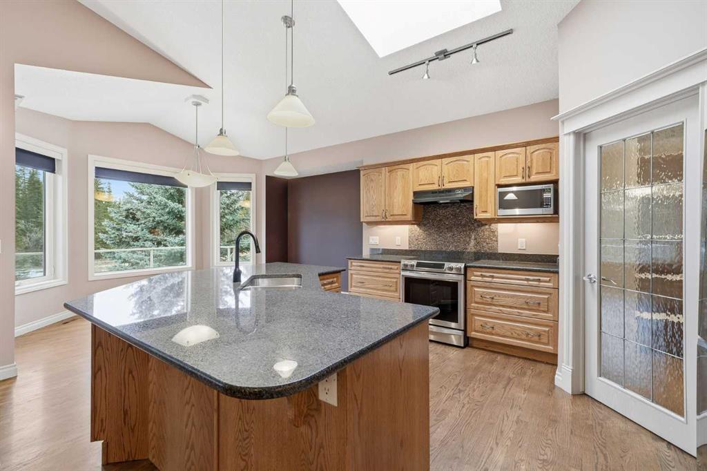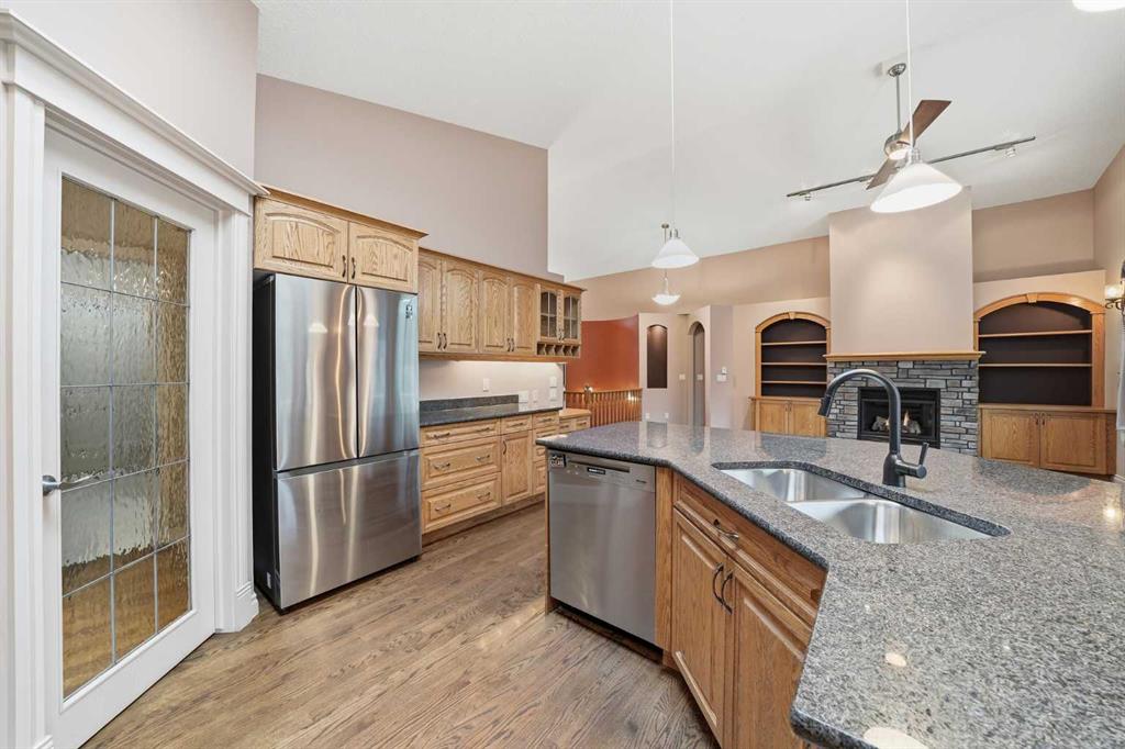 Welcome to 19 Discovery Ridge Cove SW, a remarkable bungalow that delivers the perfect balance of tranquil natural beauty and refined modern living. Nestled against lush green space with walking paths and the river just a short stroll away, this home offers a lifestyle defined by privacy, serenity, and convenience—all within one of Calgary’s most sought-after communities. From the moment you arrive, pride of ownership is evident throughout this thoughtfully designed residence. The main floor is highlighted by a spacious primary suite, complete with a stunning five-piece ensuite where antique sewing machine stands support a beautiful wood slab vanity, accompanied by a deep soaker tub and a generously sized shower—a truly distinctive touch of character and craftsmanship. Gleaming hardwood flooring guides you through the open-concept living spaces, where a vaulted ceiling amplifies the sense of light and space, and a gas fireplace flanked by built-in bookshelves creates a warm and inviting focal point. The chef’s kitchen is equally impressive, featuring a large island, granite countertops, stainless steel appliances, and an induction stove, while a convenient walk-through pantry leads to a well-appointed mudroom with lockers and a laundry room complete with a sink, cabinetry, and counter space. The walkout basement expands your living area with three additional bedrooms, a four-piece bathroom, a wet bar, and a second gas fireplace with built-in bookshelves—all offering endless possibilities for a recreation room, media space, or guest retreat. Step outside to the west-facing backyard, where a patio provides the ideal setting to unwind while overlooking the pond and waterfall feautre, the wooded green space, walking trails, and nearby wetlands. With a new furnace installed in October 2025, two water tanks, and central air conditioning, this home is truly move-in ready. Whether you are seeking a peaceful sanctuary or a space designed for effortless entertaining, this property delivers on every level. Experience the unmatched setting and exceptional details of this beautiful Discovery Ridge home for yourself—schedule your private viewing today.