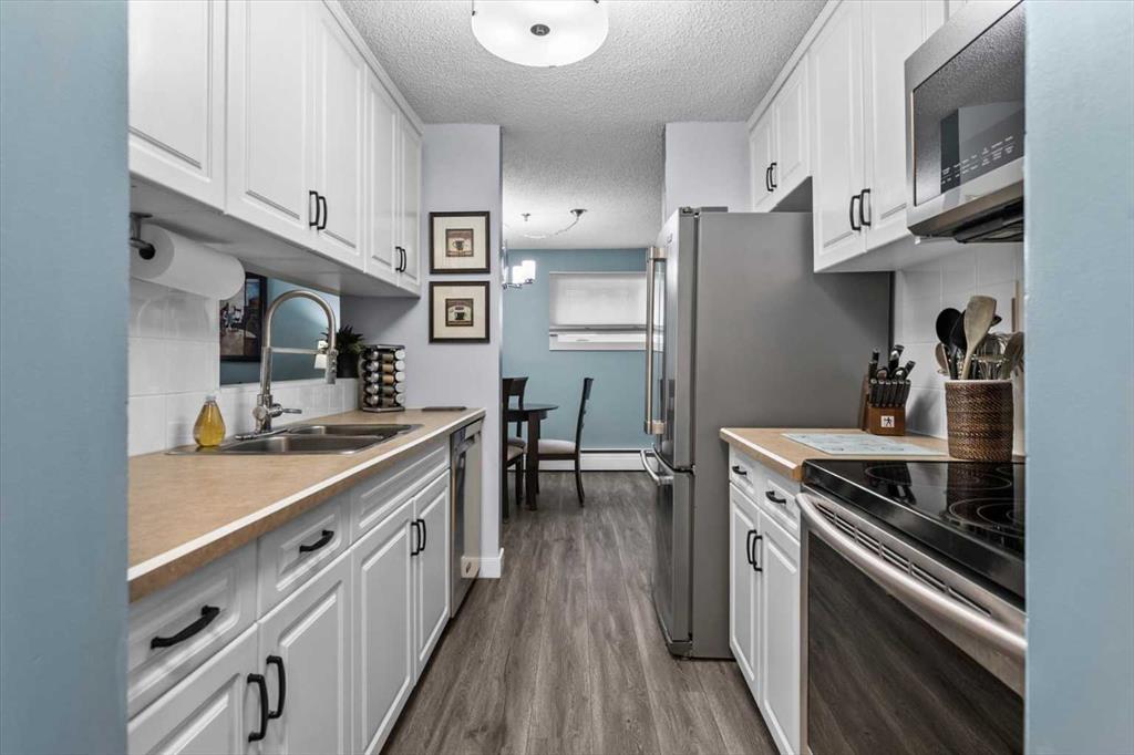 Well-maintained and thoughtfully updated Adult living 40+ building, this main floor 2-bedroom unit in Windsor Park offers comfortable living in a highly convenient location. The home features updated flooring and lighting, along with a refreshed kitchen complete with stainless steel appliances. The bathroom has also been updated with modern fixtures and includes a relaxing jacuzzi tub. Over the years, additional improvements include interior doors, trim, and electrical updates. The unit offers the added convenience of in-suite laundry and extra storage. A desirable side window allows for a refreshing cross-breeze, helping keep the space cool during warmer months. With no neighbours on either side, this unit offers a unique level of privacy. An assigned parking stall is included. Ideally located just steps to transit with quick access to downtown, and close to Chinook Centre, the LRT, grocery stores, and everyday amenities, this is a highly walkable and accessible location. The building has undergone ongoing exterior improvements and shows pride of ownership throughout, with a strong reserve fund in place. A great opportunity for those seeking value in an established central community. Quiet building. Non-smoking home. No pets permitted. Vacant and easy to show. Flexible possession.