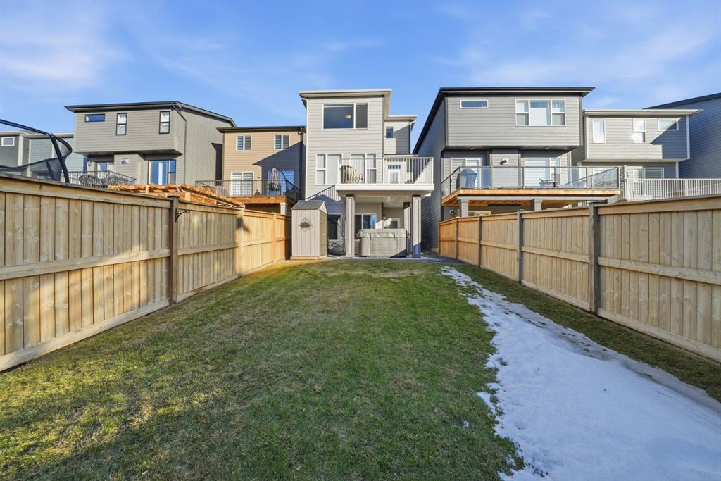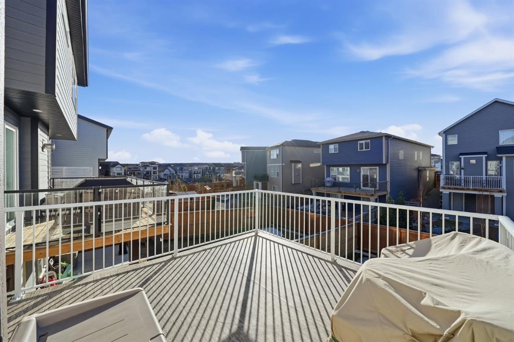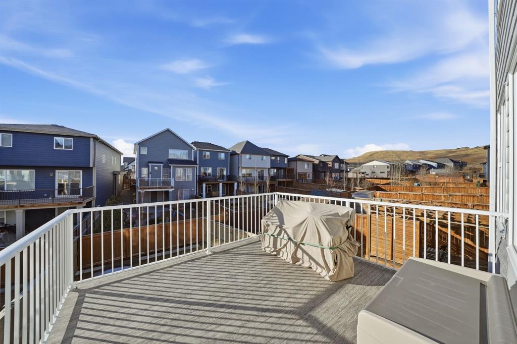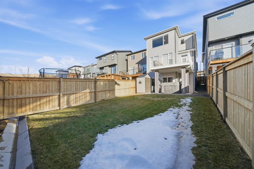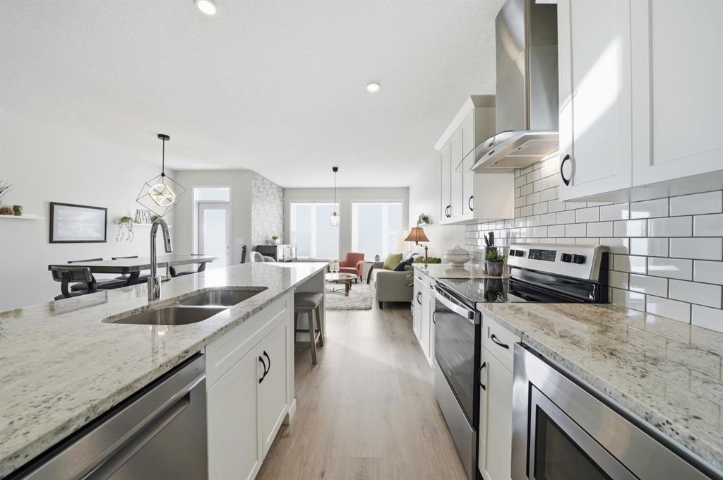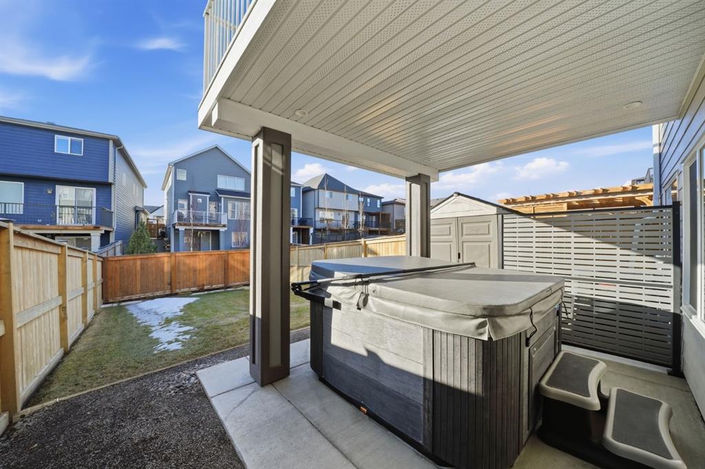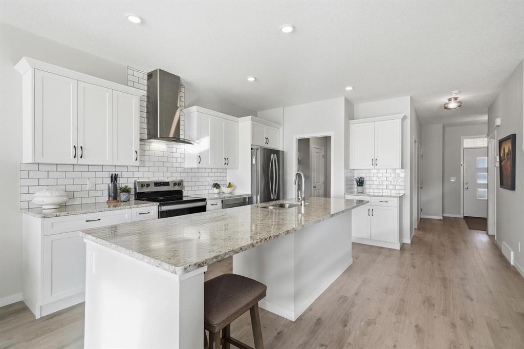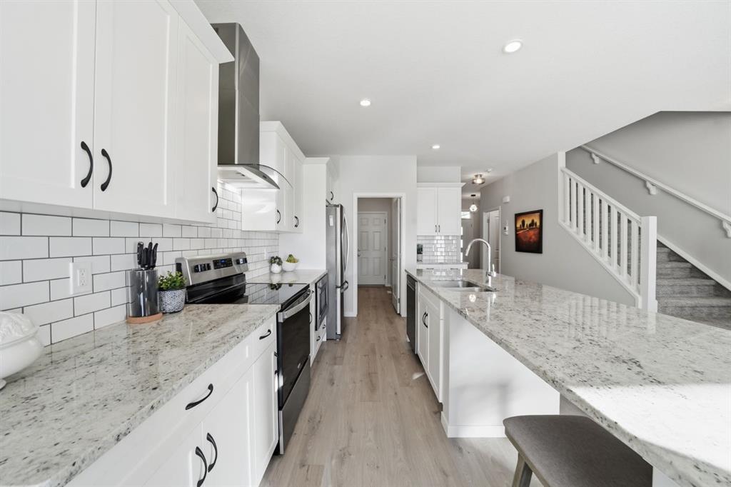 Built by Trico, this meticulously maintained two storey offers a rare combination of thoughtful design and exceptional storage throughout, creating a highly functional home from top to bottom. With a fully developed walkout basement and west facing backyard, this property is both practical and refined. The exterior showcases Hardie board siding and stonework, delivering strong curb appeal with lasting quality. Inside, laminate flooring extends through the main level and basement, complemented by upgraded lighting and window coverings throughout. The open concept main floor is anchored by a clean, modern white kitchen featuring granite countertops, subway tile backsplash, stainless steel appliances, range hood fan, a large island with seating, and extensive cabinetry along with a walk through pantry that enhances both storage and everyday convenience. The dining area opens onto an upgraded 12x12 patio, with a covered space below off the walkout level for additional outdoor living. The living room is bright and comfortable with west exposure and electric blinds, while the front attached single garage has been configured to maximize storage. A powder room completes the main floor. Upstairs, the primary suite offers a well organized walk in closet and a spacious five piece ensuite. A central bonus room provides separation and flexibility, with two additional bedrooms and a four piece bathroom located at the opposite end. Upper level laundry adds to the home’s efficiency. The fully developed walkout basement extends the living space with a three piece bathroom featuring in floor heating, along with enhanced soundproofing in both the ceiling and flooring, ideal for media, guests, or a quiet retreat or “Man Cave”. The west facing backyard is designed for low maintenance and year round enjoyment, complete with a covered patio, storage shed, and optional hot tub. Central air conditioning ensures comfort through the summer months. Well located in Cranston, close to pathways, parks, and everyday amenities.