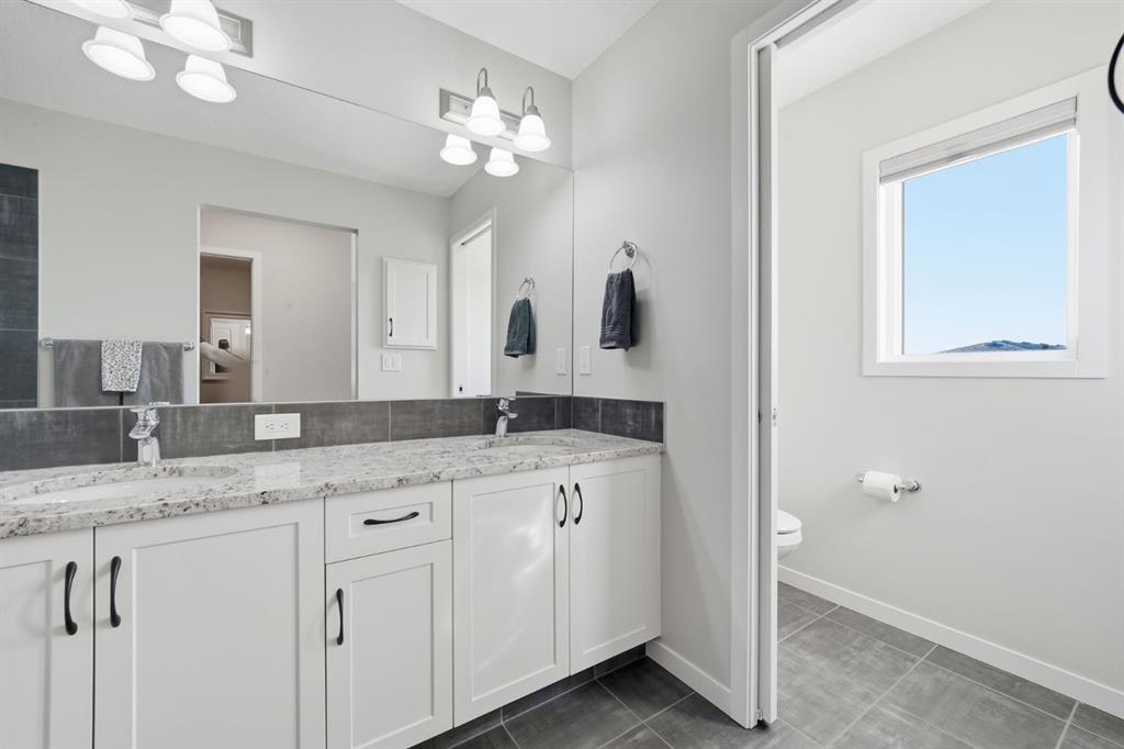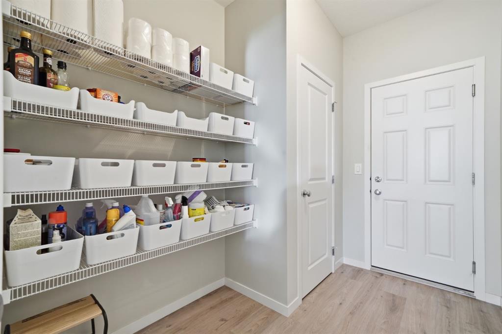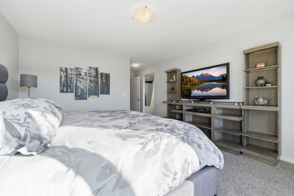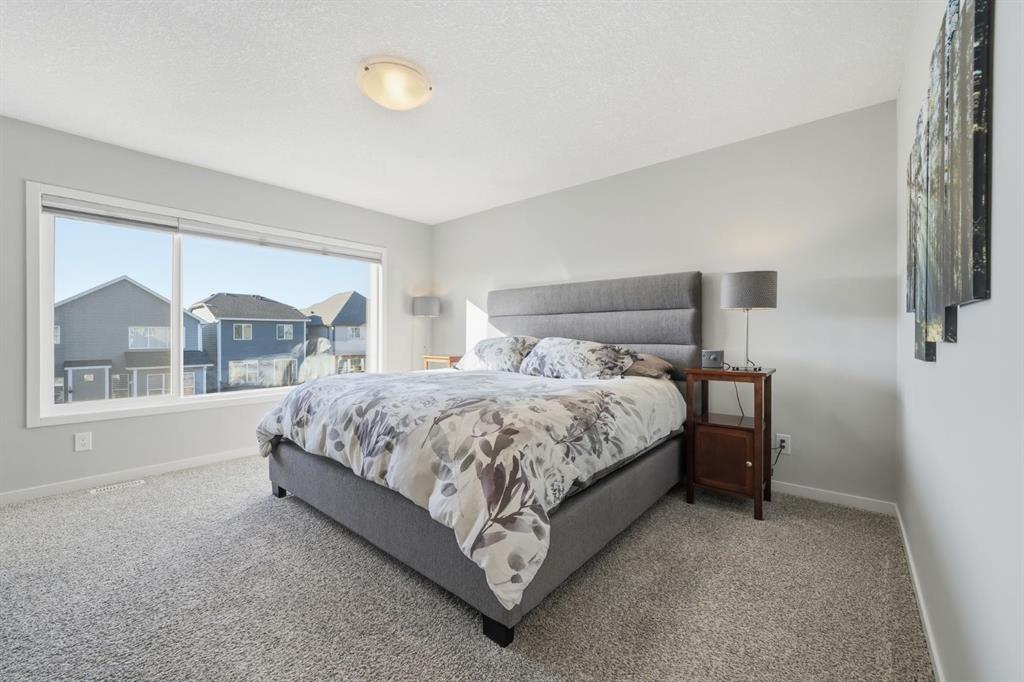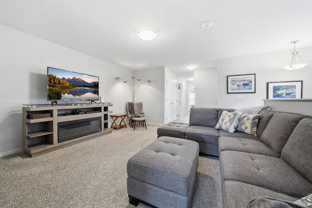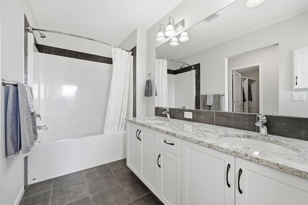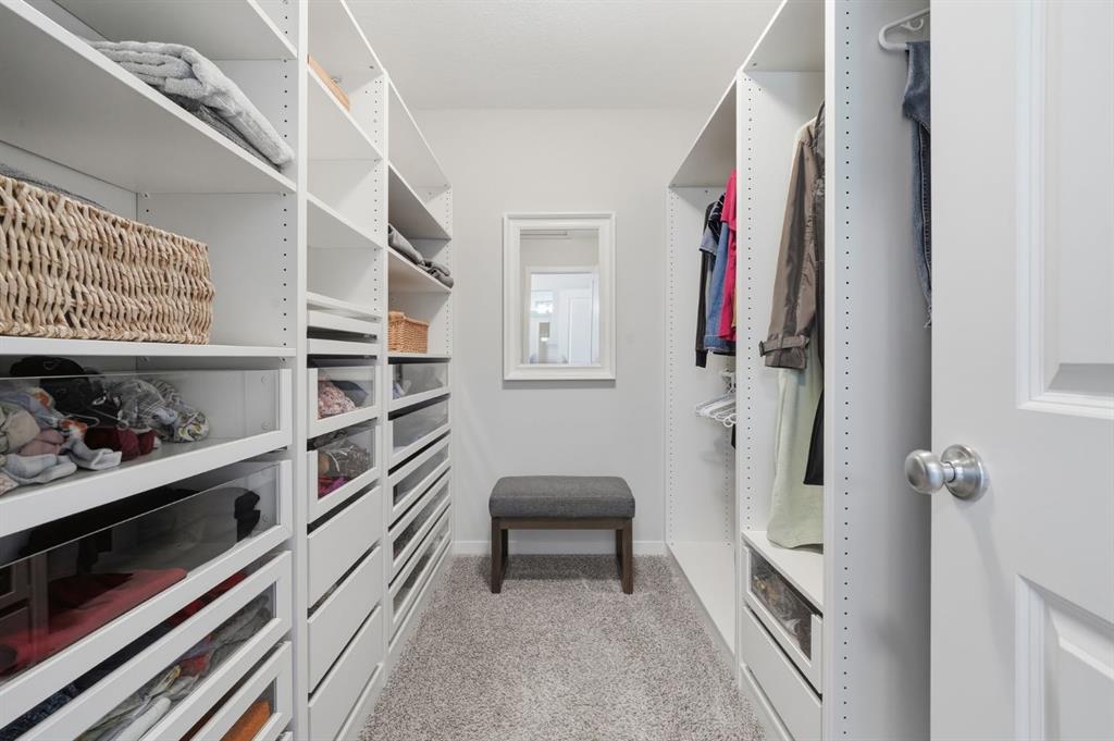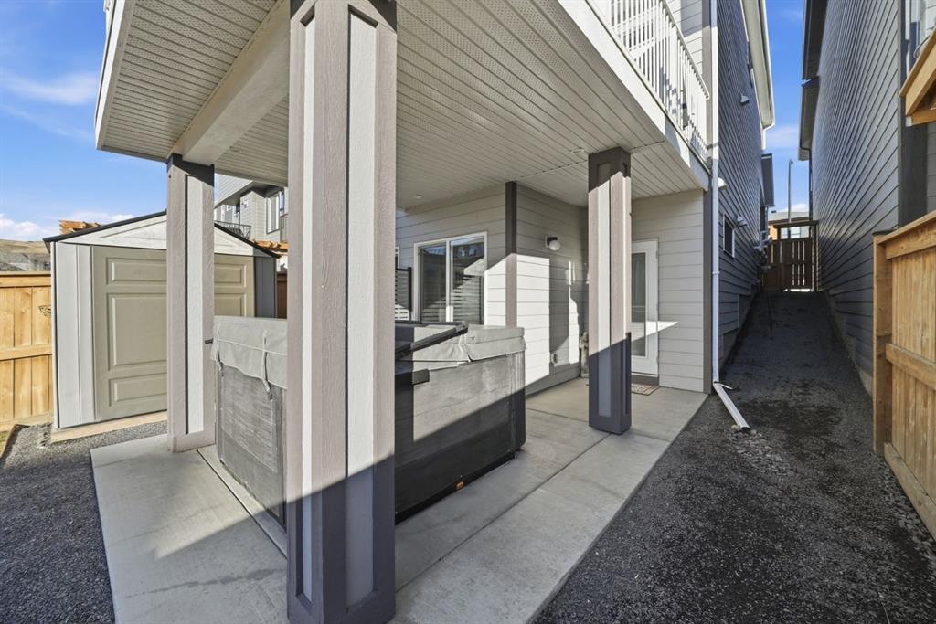 Built by Trico, this meticulously maintained two storey offers a rare combination of thoughtful design and exceptional storage throughout, creating a highly functional home from top to bottom. With a fully developed walkout basement and west facing backyard, this property is both practical and refined. The exterior showcases Hardie board siding and stonework, delivering strong curb appeal with lasting quality. Inside, laminate flooring extends through the main level and basement, complemented by upgraded lighting and window coverings throughout. The open concept main floor is anchored by a clean, modern white kitchen featuring granite countertops, subway tile backsplash, stainless steel appliances, range hood fan, a large island with seating, and extensive cabinetry along with a walk through pantry that enhances both storage and everyday convenience. The dining area opens onto an upgraded 12x12 patio, with a covered space below off the walkout level for additional outdoor living. The living room is bright and comfortable with west exposure and electric blinds, while the front attached single garage has been configured to maximize storage. A powder room completes the main floor. Upstairs, the primary suite offers a well organized walk in closet and a spacious five piece ensuite. A central bonus room provides separation and flexibility, with two additional bedrooms and a four piece bathroom located at the opposite end. Upper level laundry adds to the home’s efficiency. The fully developed walkout basement extends the living space with a three piece bathroom featuring in floor heating, along with enhanced soundproofing in both the ceiling and flooring, ideal for media, guests, or a quiet retreat or “Man Cave”. The west facing backyard is designed for low maintenance and year round enjoyment, complete with a covered patio, storage shed, and optional hot tub. Central air conditioning ensures comfort through the summer months. Well located in Cranston, close to pathways, parks, and everyday amenities.