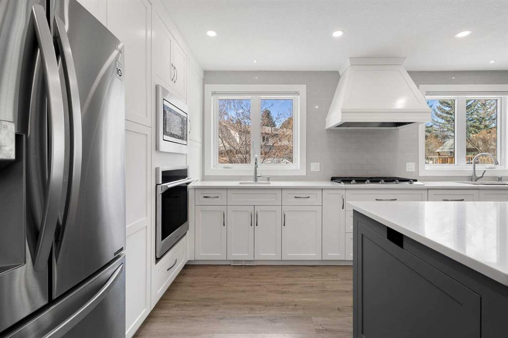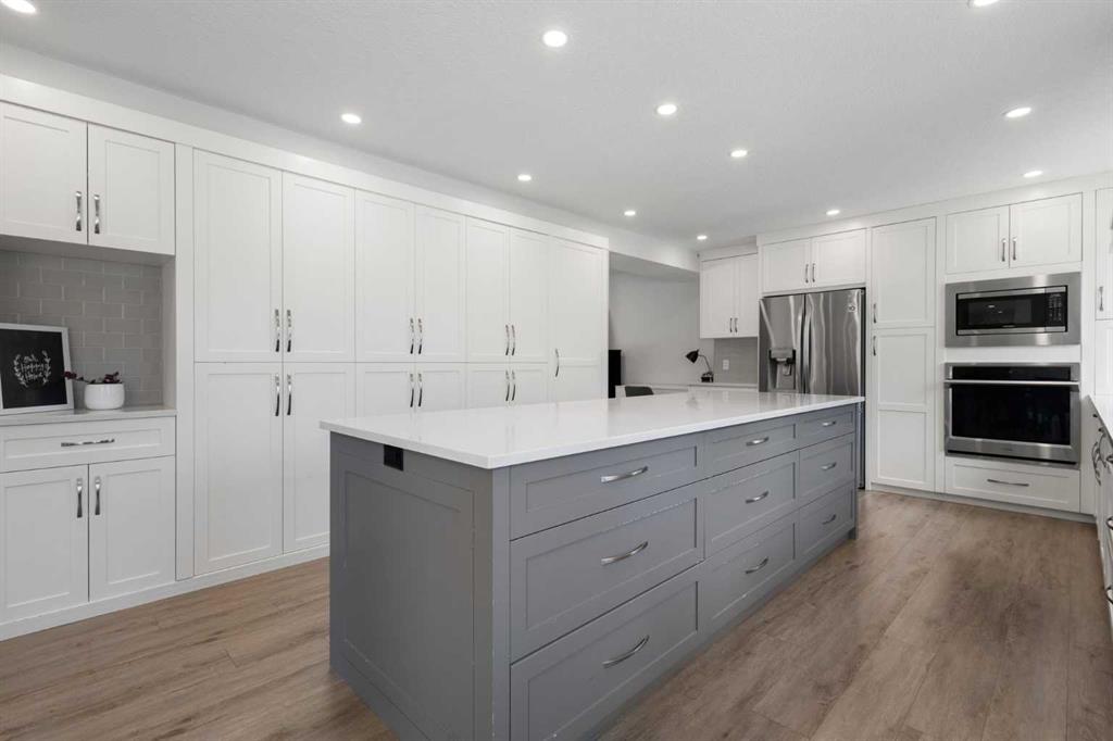 Welcome to this fully renovated estate home in Varsity Estates, ideally situated on a quiet cul-de-sac just steps from ravine pathways, expansive green space. Set on a rare oversized 9,300+ sq ft, renovated down to the studs (electrical, plumbing, HVAC, insulation, and triple pane windows) this home reflects a commitment to quality craftsmanship, thoughtful design, and timeless finishes throughout. Equipped with solar panels, the home also offers improved energy efficiency and long-term cost savings. Offering over 2,600 sq ft above grade and more than 3,700 sq ft of total developed living space, this impressive home features a triple garage, 5 bedrooms, and 3.5 bathrooms, delivering the scale, functionality, and refinement expected in Varsity Estates. The main floor is anchored by a stunning designer kitchen, thoughtfully crafted for both everyday living and entertaining. Featuring a large central island, quartz countertops, custom cabinetry, and premium stainless steel appliances, this space is elevated by a gas cooktop, custom canopy hood fan, built-in wall oven and microwave, dual sinks, and extensive storage throughout—a rare combination of style and functionality. The open-concept layout flows seamlessly into spacious living and dining areas filled with natural light, while a dedicated main floor office/den offers flexibility for working from home. Upstairs, you’ll find four generously sized bedrooms, including a well-appointed primary retreat with ensuite bathroom featuring tiled shower with glass enclosure! Both upper bathrooms offer dual vanities, quartz countertops, and private water closet areas, creating a refined, spa-inspired experience. The fully developed basement expands your living space with a large recreation room, an additional bedroom, full bathroom, and oversized storage room. Located just minutes from Market Mall, the University of Calgary, Foothills & Children’s Hospitals, some Calgary’s top-ranked schools and major transit routes, this home offers the perfect balance of convenience and an established, nature-rich setting.