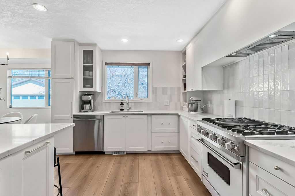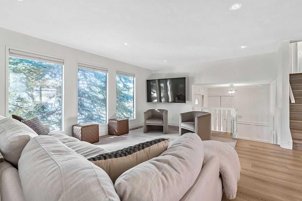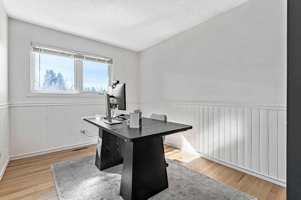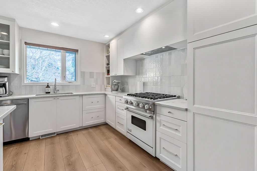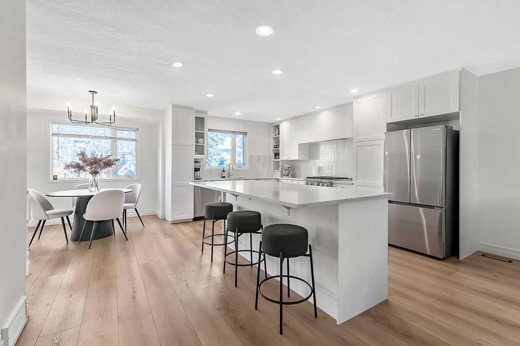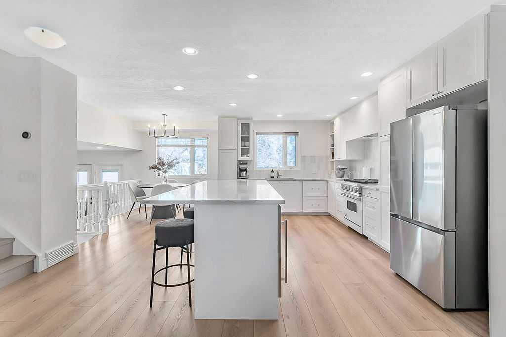 BEAUTIFULLY RENOVATED, WELL MAINTAINED 2 storey split on a quiet cul-de-sac in a premier spot in desirable Woodlands! Situated on a large, private lot (over 6300 sq ft) this home is located in a fantastic location - just a short walk down a path to Fish Creek Park, close to schools, shopping, transit and the ring road. The home offers over 2300 sq ft of developed living space with 4 bedrooms (one on the main floor that could be used as an office or den), 2 four piece bathrooms on the upper level and a two piece bathroom on the main level. The main floor was tastefully upgraded in 2023 with luxury vinyl plank flooring and a gorgeous spacious kitchen featuring a massive island, new refrigerator, new beverage fridge, new dishwasher & a classic Viking gas range. A well thought out floor plan provides perfect spaces for entertaining in either the kitchen, expansive main living room or in the cozy lower family room complete with a wood fireplace (which has a heatilator insert with an optional fan that can heat the home) & garden doors opening up onto the spacious deck & lovely back garden. A mudroom/laundry room which holds the stacked washer and dryer completes this level. The second level has hardwood throughout its 3 bedrooms. The primary bedroom has lots of storage with closet organizers and has a 4 piece ensuite. The other 2 bedrooms are spacious with one having a murphy bed for flexibility. The lower level offers an expansive recreation room and a separate storage area. There is a new hot water tank (2022), hook up for a Kinetico system, humidifier and water softner. The oversized heated double garage (with work bench!) is situated facing the street and is at the end of a side driveway that can accommodate extra vehicles. New shingles for the garage were installed in 2024. This home is a perfect blend of style, space and functionality and is move in ready. Rarely do homes with renovations of this kind come on the market in this desired community!