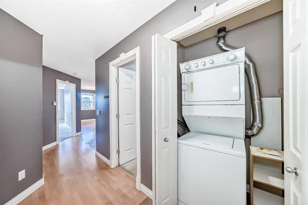 Experience elevated inner city living with south views in sought after Crescent Heights with this spacious 2 bedroom, 2 full bathroom condo plus a large den, offering over 1,000 sq. ft. of corner unit space and titled underground parking. Perched on a quiet cul-de-sac, this bright unit showcases stunning, unobstructed views of downtown Calgary and the Bow River Valley, creating the perfect backdrop for everyday living. The open concept layout is ideal for both relaxing and entertaining, featuring a functional kitchen with a raised breakfast bar, ample cabinetry, and seamless flow into the generous dining area and cozy living room complete with a corner gas fireplace. Step outside to your south facing covered balcony perfect for year round enjoyment. The primary bedroom easily accommodates a king sized bed and includes a walk-through closet with built in shelving and a private 4 piece ensuite. The second bedroom, positioned on the opposite side of the unit for added privacy, is ideal for guests, roommates, or family. A second full 4 piece bathroom and in suite laundry add everyday convenience. A standout feature is the large den, perfect for a home office, gym, or additional storage adding versatility to the space.