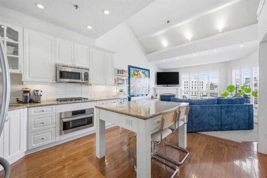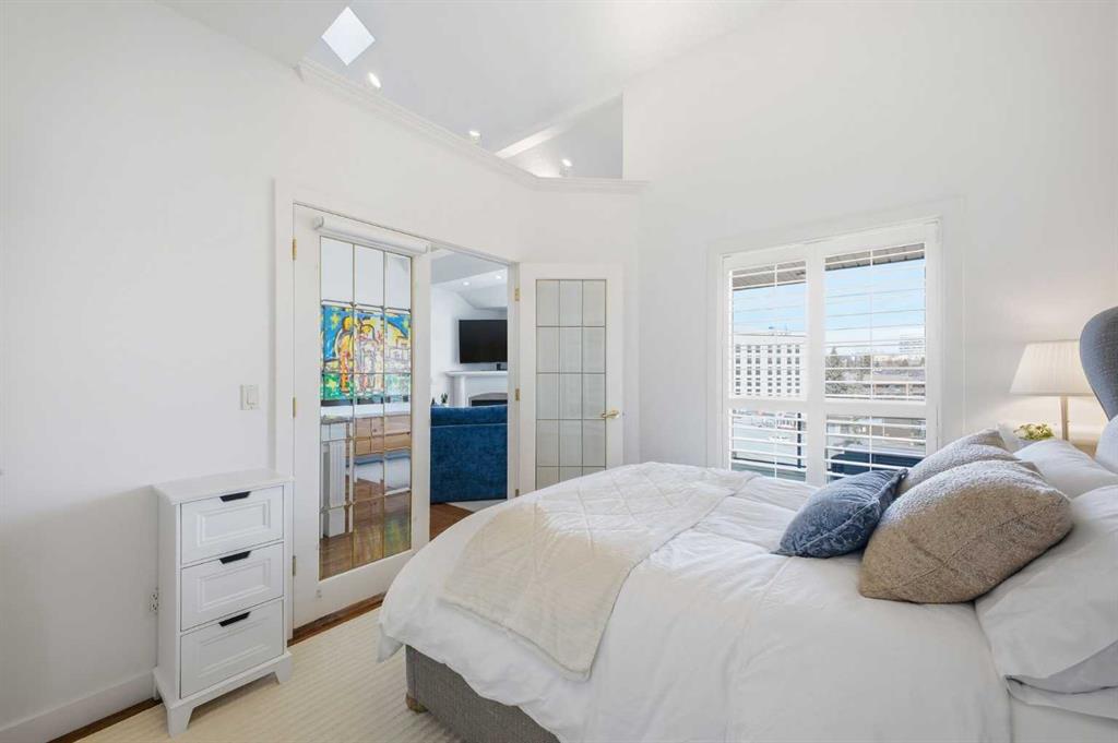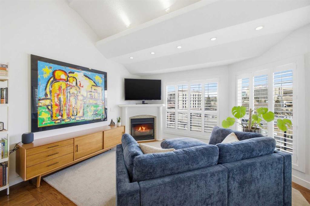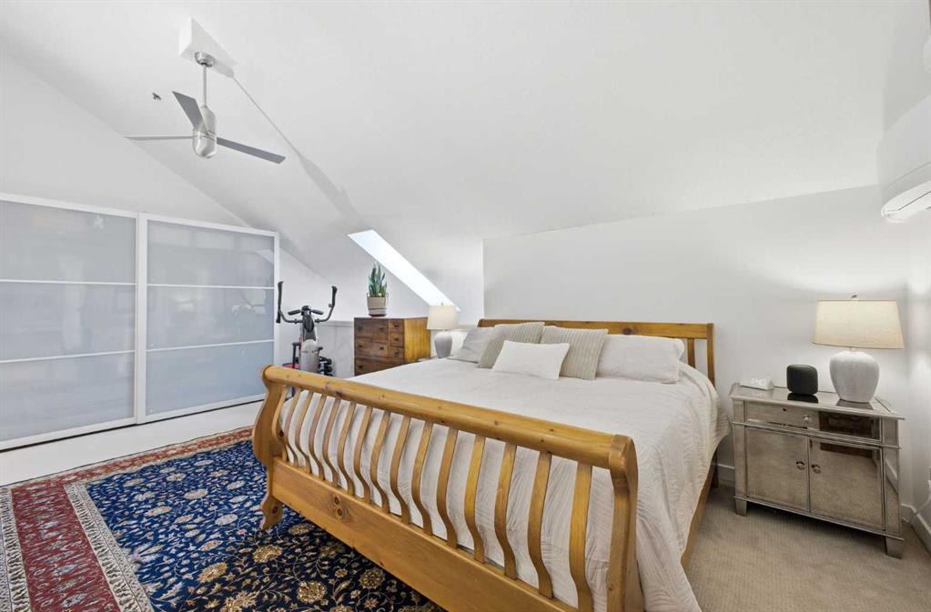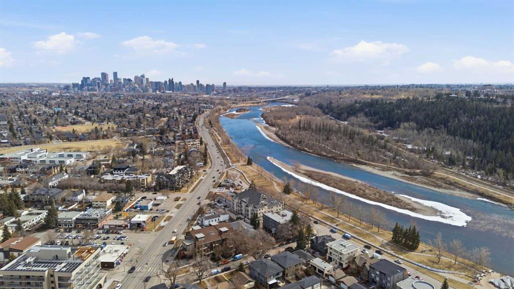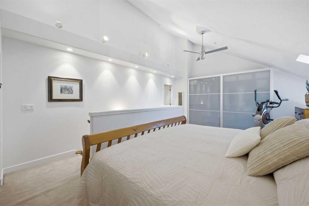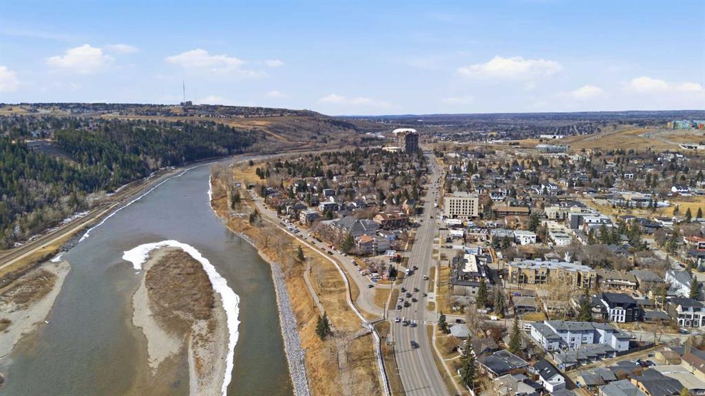 This rare two storey, 3 bedroom, 3 full bathroom top floor condo sits just steps from the scenic Bow River pathway system and offers exceptional space, soaring vaulted ceilings with skylight, and nearly $45,000 in recent upgrades—all within an exceptionally quiet, boutique 28 unit building. The bright, open main level features a generous living area with a refreshed feature fireplace and access to a large balcony with expansive views of mixed green space and the city. From this fourth floor vantage point, enjoy sightlines to the Bow River Valley escarpment to the west, St. Andrew’s Heights, the Parkdale Hillside Trailhead, and the Foothills Hospital complex, which creates a warm, glittering backdrop after sunset. The well appointed kitchen offers granite countertops, abundant storage, and a full suite of upgraded appliances including a brand new Bosch oven, Bosch gas cooktop, Bosch dishwasher, and a new LG ThinQ refrigerator with water and ice dispenser. Two bedrooms—both with French doors—and two full bathrooms are located on the main level. The primary bedroom features ample closet space and a private 4 piece ensuite with a relaxing jetted tub and separate shower. The upper level hosts a private, versatile loft space enhanced by vaulted ceilings and a skylight that fills the area with natural light. This flexible room can serve as a third bedroom, home office, or quiet retreat. A third full bathroom with laundry facilities completes the upper level. Major recent upgrades include a high efficiency, whisper quiet Daikin 3 head ductless air conditioning/heat pump system (5 year warranty) providing independent heating and cooling in every room; a 75 gallon Bradford White True Combi Tank hot water system (6 year warranty); new hot water tank valves and piping; a custom California Closets front entry closet system; custom Hunter Douglas roller shades on the French doors of all main level bedrooms; and a full fireplace overhaul and cleaning. Additional features include fresh paint throughout, in floor heating, and refreshed bathrooms with new ceiling fans and hardware. Two titled underground heated parking stalls—a significant advantage in this location—plus a convenient storage unit directly in front of one stall complete this outstanding offering. Directly across from the Bow River, the building provides immediate access to the river pathway system, Edworthy Park, the Douglas Fir Trail, and countless outdoor amenities, while still being minutes to schools, shopping, transit, the University of Calgary, Foothills and Children’s Hospitals, and major routes.