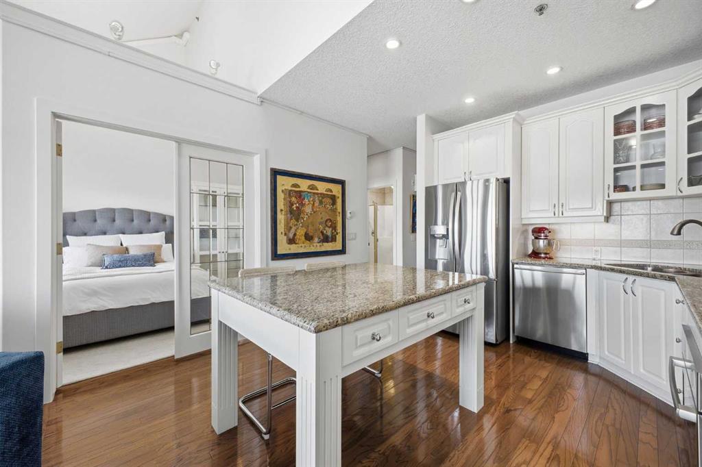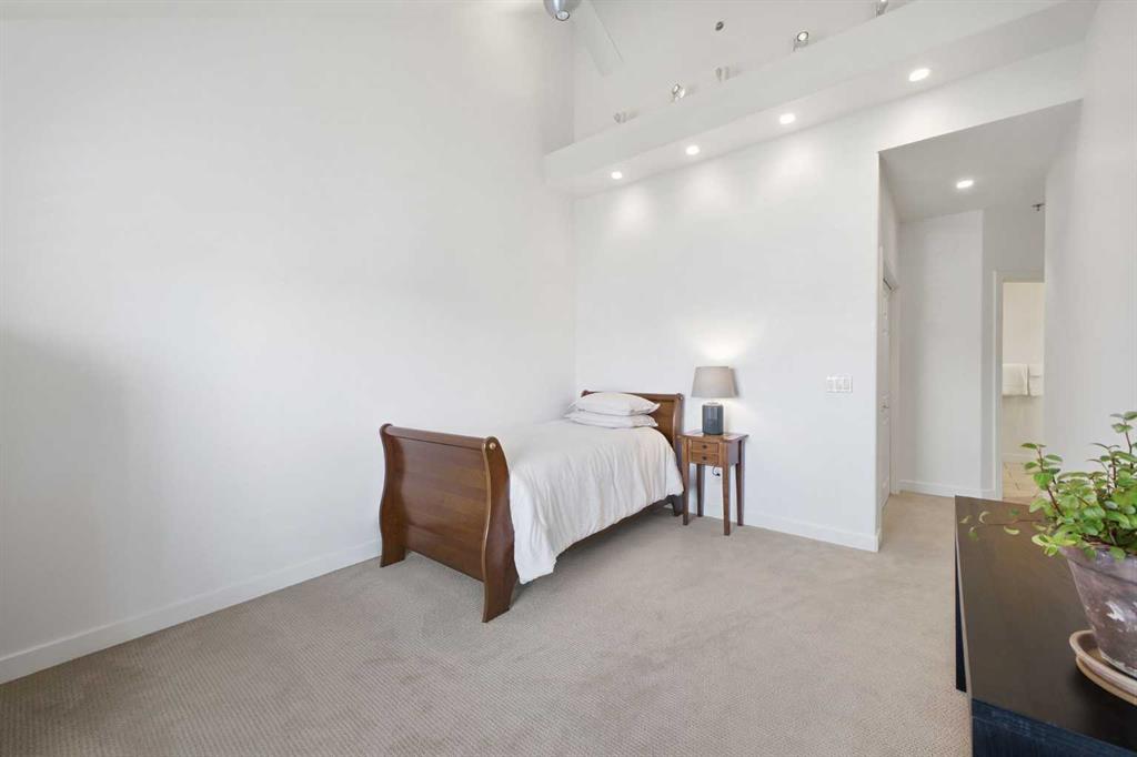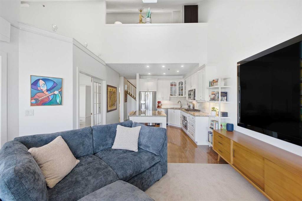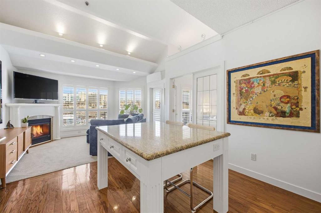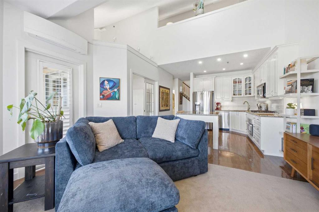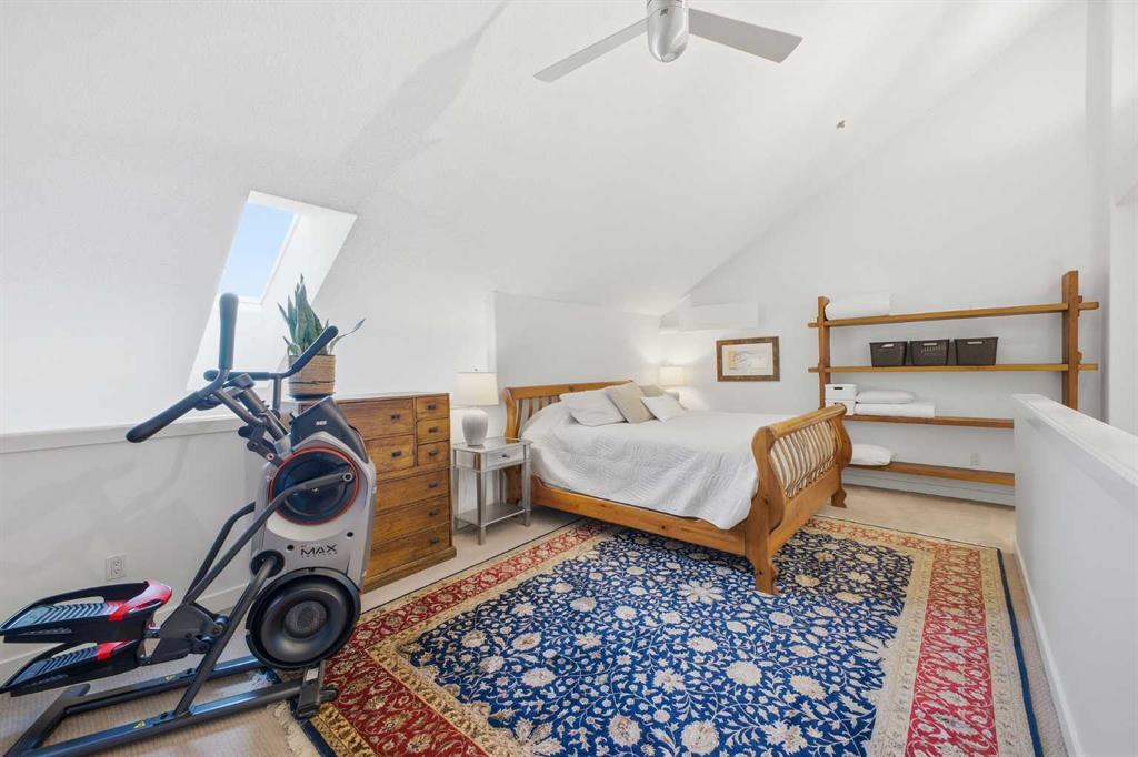 This rare two storey, 3 bedroom, 3 full bathroom top floor condo sits just steps from the scenic Bow River pathway system and offers exceptional space, soaring vaulted ceilings with skylight, and nearly $45,000 in recent upgrades—all within an exceptionally quiet, boutique 28 unit building. The bright, open main level features a generous living area with a refreshed feature fireplace and access to a large balcony with expansive views of mixed green space and the city. From this fourth floor vantage point, enjoy sightlines to the Bow River Valley escarpment to the west, St. Andrew’s Heights, the Parkdale Hillside Trailhead, and the Foothills Hospital complex, which creates a warm, glittering backdrop after sunset. The well appointed kitchen offers granite countertops, abundant storage, and a full suite of upgraded appliances including a brand new Bosch oven, Bosch gas cooktop, Bosch dishwasher, and a new LG ThinQ refrigerator with water and ice dispenser. Two bedrooms—both with French doors—and two full bathrooms are located on the main level. The primary bedroom features ample closet space and a private 4 piece ensuite with a relaxing jetted tub and separate shower. The upper level hosts a private, versatile loft space enhanced by vaulted ceilings and a skylight that fills the area with natural light. This flexible room can serve as a third bedroom, home office, or quiet retreat. A third full bathroom with laundry facilities completes the upper level. Major recent upgrades include a high efficiency, whisper quiet Daikin 3 head ductless air conditioning/heat pump system (5 year warranty) providing independent heating and cooling in every room; a 75 gallon Bradford White True Combi Tank hot water system (6 year warranty); new hot water tank valves and piping; a custom California Closets front entry closet system; custom Hunter Douglas roller shades on the French doors of all main level bedrooms; and a full fireplace overhaul and cleaning. Additional features include fresh paint throughout, in floor heating, and refreshed bathrooms with new ceiling fans and hardware. Two titled underground heated parking stalls—a significant advantage in this location—plus a convenient storage unit directly in front of one stall complete this outstanding offering. Directly across from the Bow River, the building provides immediate access to the river pathway system, Edworthy Park, the Douglas Fir Trail, and countless outdoor amenities, while still being minutes to schools, shopping, transit, the University of Calgary, Foothills and Children’s Hospitals, and major routes.