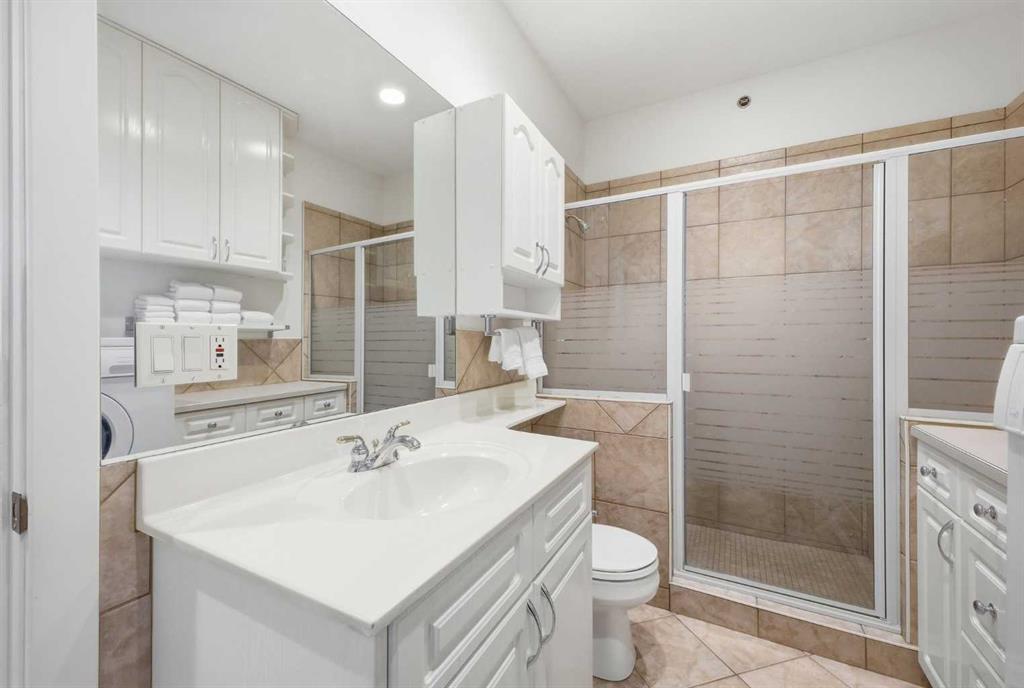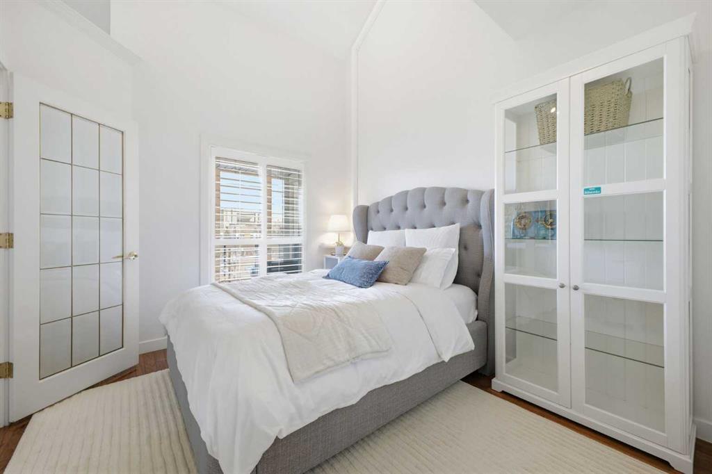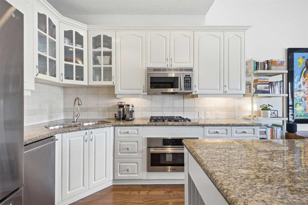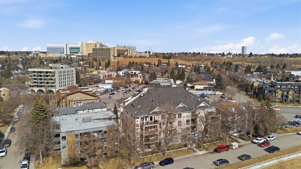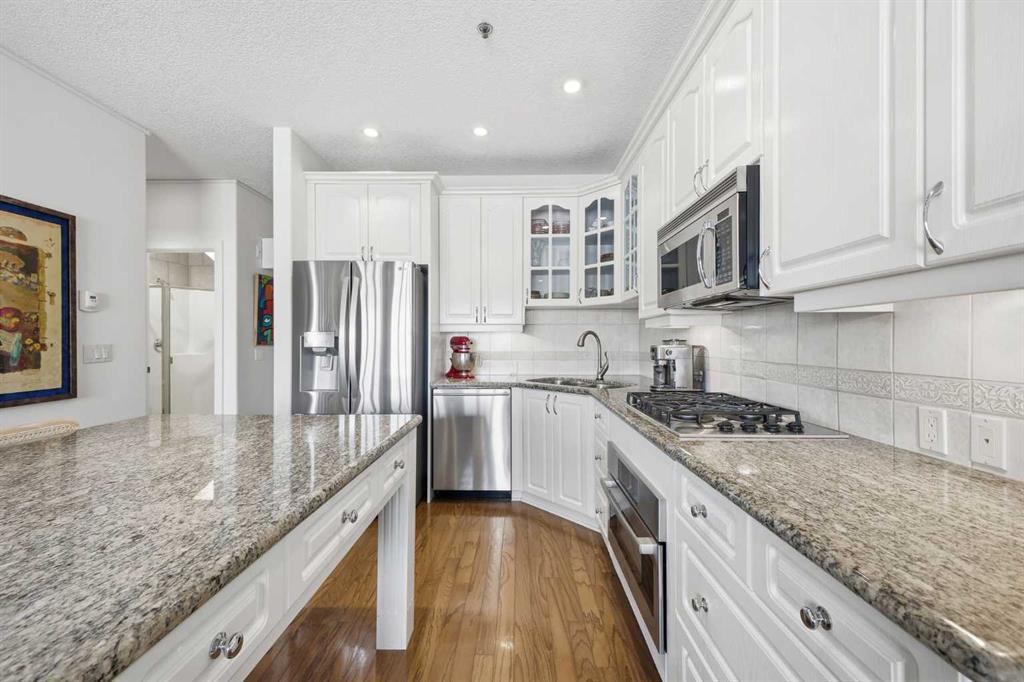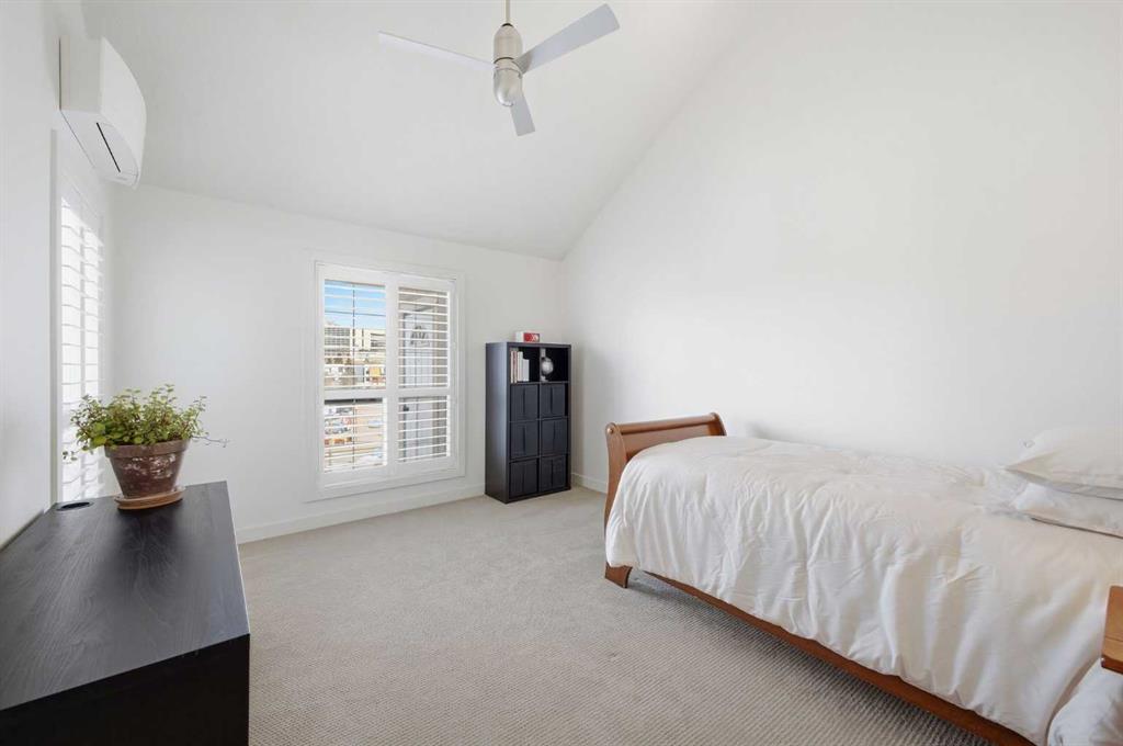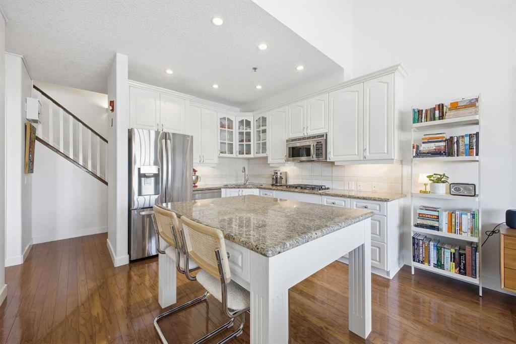This rare two storey, 3 bedroom, 3 full bathroom top floor condo sits just steps from the scenic Bow River pathway system and offers exceptional space, soaring vaulted ceilings with skylight, and nearly $45,000 in recent upgrades—all within an exceptionally quiet, boutique 28 unit building. The bright, open main level features a generous living area with a refreshed feature fireplace and access to a large balcony with expansive views of mixed green space and the city. From this fourth floor vantage point, enjoy sightlines to the Bow River Valley escarpment to the west, St. Andrew’s Heights, the Parkdale Hillside Trailhead, and the Foothills Hospital complex, which creates a warm, glittering backdrop after sunset. The well appointed kitchen offers granite countertops, abundant storage, and a full suite of upgraded appliances including a brand new Bosch oven, Bosch gas cooktop, Bosch dishwasher, and a new LG ThinQ refrigerator with water and ice dispenser. Two bedrooms—both with French doors—and two full bathrooms are located on the main level. The primary bedroom features ample closet space and a private 4 piece ensuite with a relaxing jetted tub and separate shower. The upper level hosts a private, versatile loft space enhanced by vaulted ceilings and a skylight that fills the area with natural light. This flexible room can serve as a third bedroom, home office, or quiet retreat. A third full bathroom with laundry facilities completes the upper level. Major recent upgrades include a high efficiency, whisper quiet Daikin 3 head ductless air conditioning/heat pump system (5 year warranty) providing independent heating and cooling in every room; a 75 gallon Bradford White True Combi Tank hot water system (6 year warranty); new hot water tank valves and piping; a custom California Closets front entry closet system; custom Hunter Douglas roller shades on the French doors of all main level bedrooms; and a full fireplace overhaul and cleaning. Additional features include fresh paint throughout, in floor heating, and refreshed bathrooms with new ceiling fans and hardware. Two titled underground heated parking stalls—a significant advantage in this location—plus a convenient storage unit directly in front of one stall complete this outstanding offering. Directly across from the Bow River, the building provides immediate access to the river pathway system, Edworthy Park, the Douglas Fir Trail, and countless outdoor amenities, while still being minutes to schools, shopping, transit, the University of Calgary, Foothills and Children’s Hospitals, and major routes.