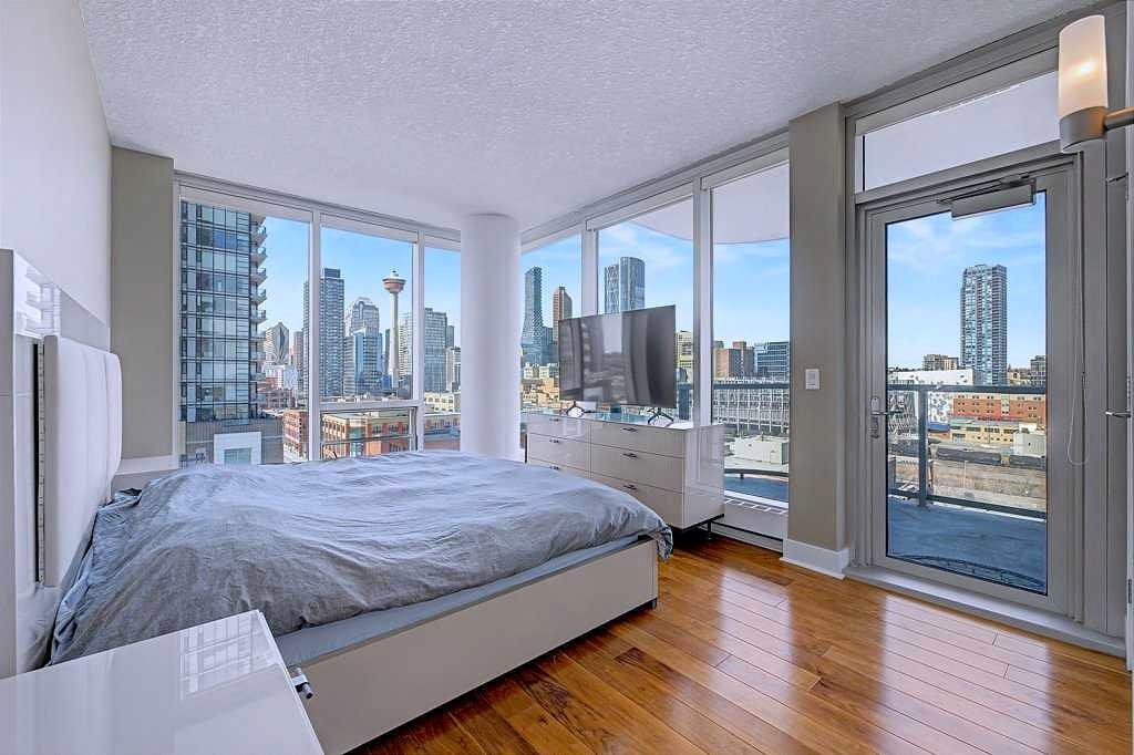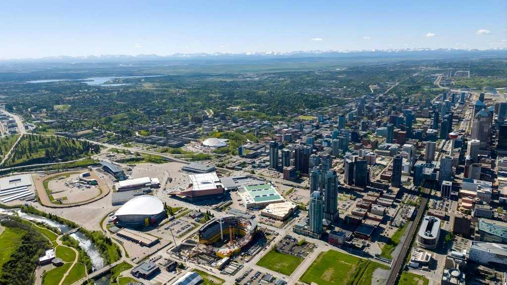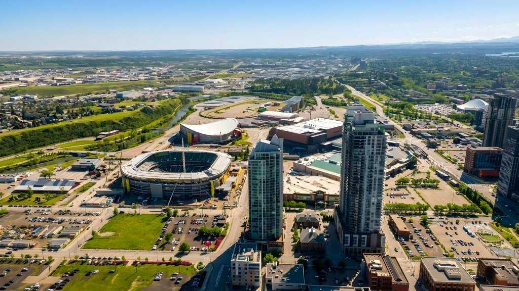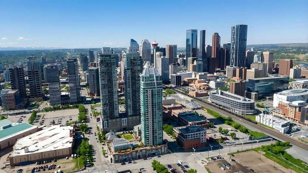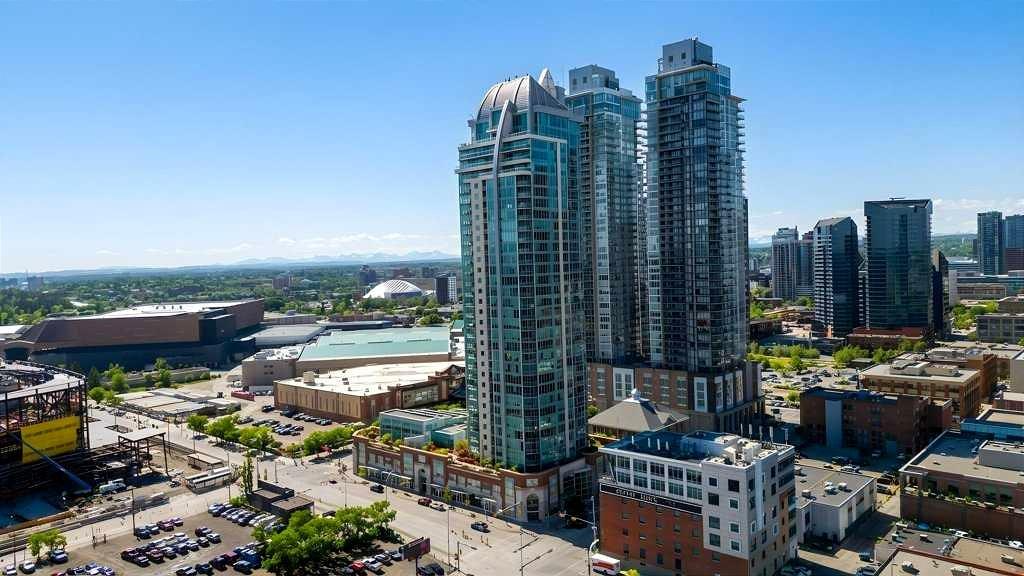 Welcome to Arriva, one of Calgary’s premier high-rise addresses. Prime corner location on the 10th floor with northwest exposure, this beautifully appointed residence offers over 1,200 square feet of refined urban living and spectacular downtown and city views. Offering 2 bedrooms, 2 full bathrooms, 2 titled underground parking stalls, assigned storage, and central air conditioning. The open-concept living, dining, and kitchen area is bright, spacious, and designed for comfortable everyday living and easy entertaining. Floor-to-ceiling windows make an immediate impression, flooding the home with natural light and showcasing the skyline from every room. Rich hardwood and tile add warmth and sophistication throughout. The contemporary Snaidero kitchen is both stylish and functional, featuring quartz counters, a large island, generous pantry space, and a premium Miele appliance package including a 5-burner gas cooktop. The primary bedroom offers excellent space, a custom walk-through closet, a 4-piece ensuite with separate shower and soaker tub, and access to one of two private balconies. The second bedroom is flexible and thoughtfully designed, ideal as a guest room, office, or both, complete with a built-in Murphy bed/storage dresser. With two separate balconies, a stunning lobby, full-time concierge/security, guest suites, and an outstanding location close to downtown, new convention center and arena, restaurants, fitness, and entertainment, this is an exceptional opportunity to own a beautifully finished home in one of Calgary’s most sought-after buildings.