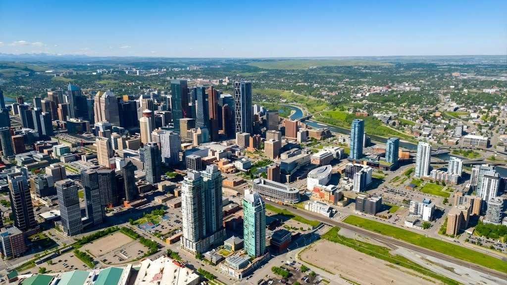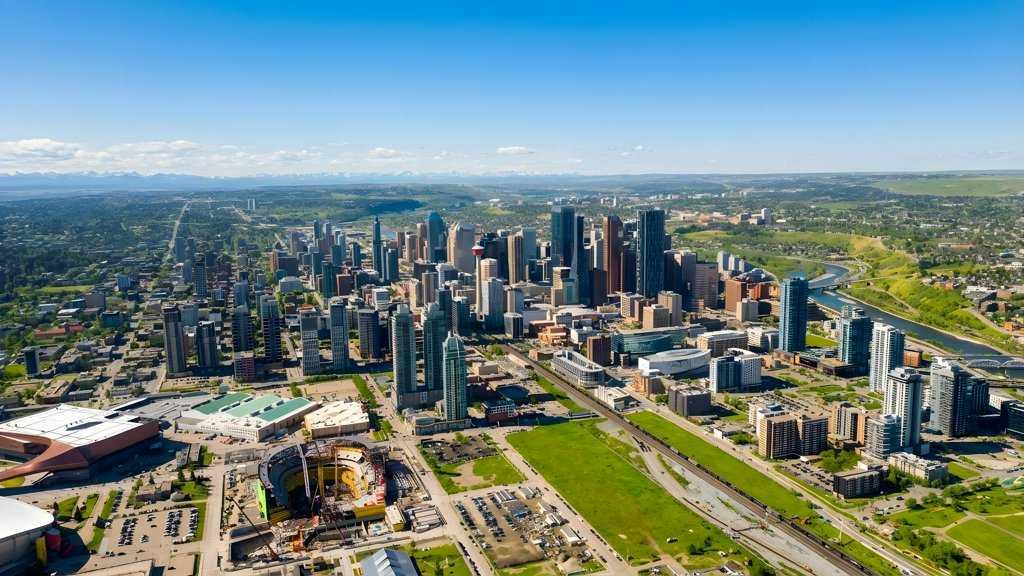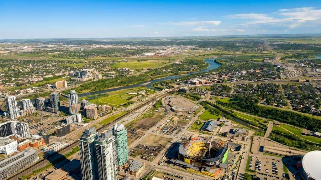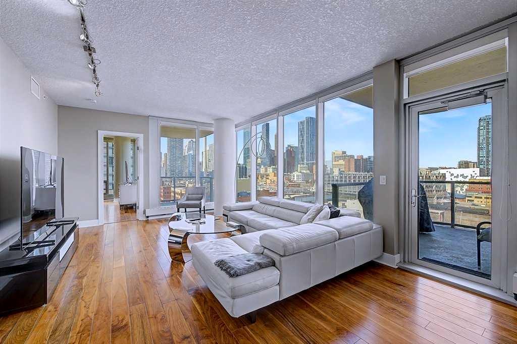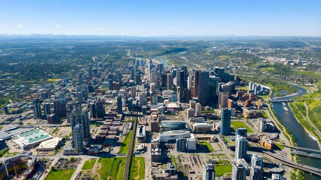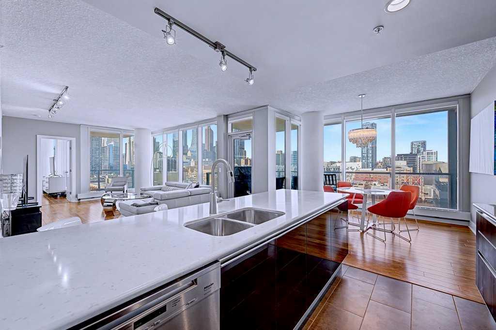 Welcome to Arriva, one of Calgary’s premier high-rise addresses. Prime corner location on the 10th floor with northwest exposure, this beautifully appointed residence offers over 1,200 square feet of refined urban living and spectacular downtown and city views. Offering 2 bedrooms, 2 full bathrooms, 2 titled underground parking stalls, assigned storage, and central air conditioning. The open-concept living, dining, and kitchen area is bright, spacious, and designed for comfortable everyday living and easy entertaining. Floor-to-ceiling windows make an immediate impression, flooding the home with natural light and showcasing the skyline from every room. Rich hardwood and tile add warmth and sophistication throughout. The contemporary Snaidero kitchen is both stylish and functional, featuring quartz counters, a large island, generous pantry space, and a premium Miele appliance package including a 5-burner gas cooktop. The primary bedroom offers excellent space, a custom walk-through closet, a 4-piece ensuite with separate shower and soaker tub, and access to one of two private balconies. The second bedroom is flexible and thoughtfully designed, ideal as a guest room, office, or both, complete with a built-in Murphy bed/storage dresser. With two separate balconies, a stunning lobby, full-time concierge/security, guest suites, and an outstanding location close to downtown, new convention center and arena, restaurants, fitness, and entertainment, this is an exceptional opportunity to own a beautifully finished home in one of Calgary’s most sought-after buildings.