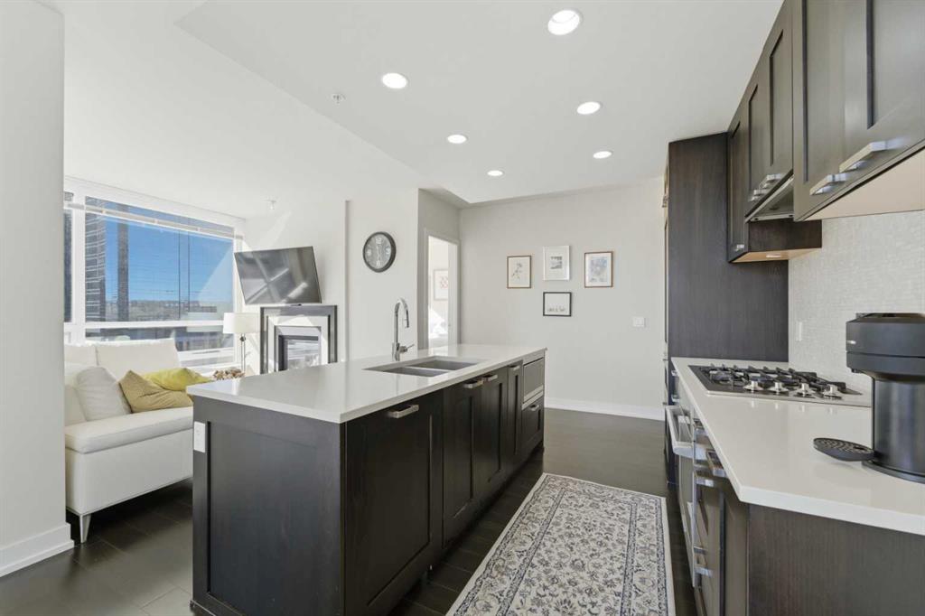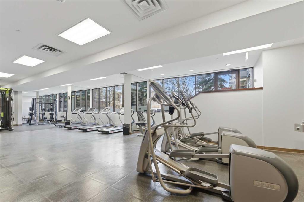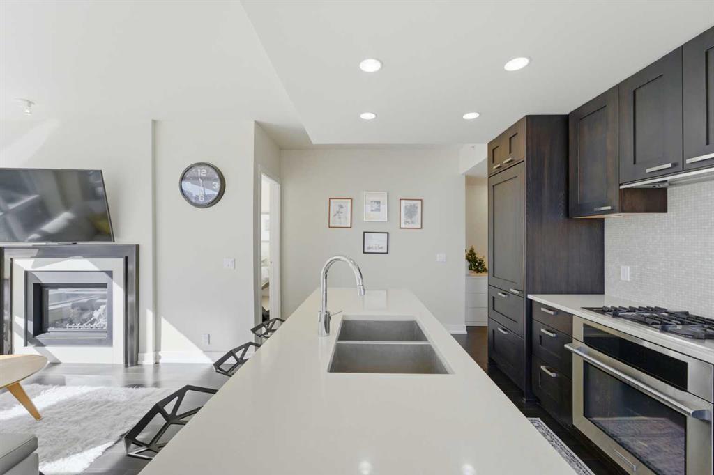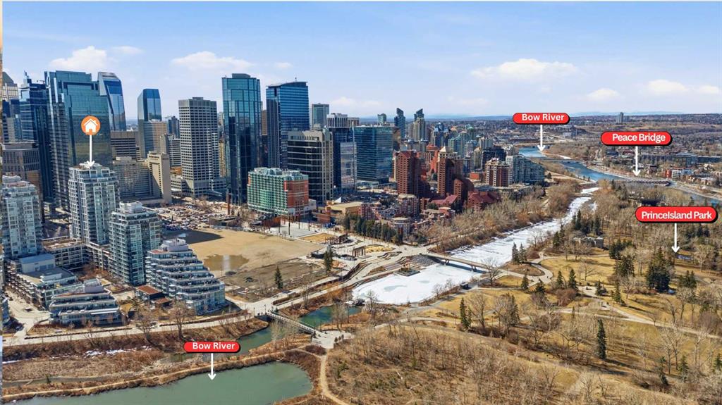 OPEN HOUSE: Saturday, March 28 and Sunday, March 29 from 11 AM to 1 PM. Bright and sunny, corner 2 bedroom and 2 bath in a concrete building. Flooded with beautiful light, this south east corner unit, has amazing city and river views. Very open plan with gourmet kitchen, with gas stove, quart counters, large eating bar. South facing living room with gas fireplace. Master bedroom has a spa style suite, and duel closets. Second bedroom is well located, for privacy making it ideal for a roommate. Underground parking and storage locker are included. Building amenities include a fitness center (weight, cardio equipment and jacuzzi tub), social room, theatre, and of a concierge desk. Lots of visitor parking for friends and family. Prime Eau Claire location steps for coffee shops, restaurants, shopping, river walkways, bike paths, restaurants, downtown nightlife, and transit. Immediate possession.