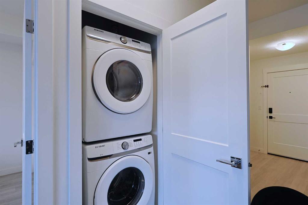 This is your chance to make your home in Logel Homes’ popular SAGE WALK project in this fantastic top floor condo just steps to the Sage Hill Crossing retail centre, winding ravine trails & bus stops. Available for quick possession, this terrific 2 bedroom / 1 bath home has high ceilings & vinyl plank floors, quartz countertops, covered balcony & titled underground parking for your exclusive use. Dynamite open concept floorplan featuring spacious living room with Northwest-facing balcony (complete with gas BBQ line), eat-in kitchen with quartz counters & soft-close cabinetry, Whirlpool stainless steel appliances & insuite laundry with stacking Samsung washer & dryer. Primary bedroom has a deep closet & Northwest-facing window. The 2nd bedroom easily doubles as a home office, & is across from the well-appointed full bathroom with tile floors & quartz counters. Your parking stall – with adjoining storage cage, has a prime location in the underground parkade…an end unit so just 1 neighbouring stall. Monthly maintenance fees in this pet-friendly (with board approval) complex include heat & water-sewer. The massive Sage Hill Crossing complex is walking distance from your front door…& features a Walmart Supercentre, TnT Supermarket, Dollarama, Bulk Barn, Value Village, Planet Fitness, bottle depot, restaurants, banks, medical clinics & so much more! With its quick access to major roadways (Shaganappi/Sarcee/Stoney/Deerfoot Trails, Symons Valley Parkway & Road), your new home is just minutes to regional parks & recreation, the airport, Cross Iron Mills, University of Calgary & downtown.
