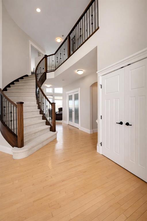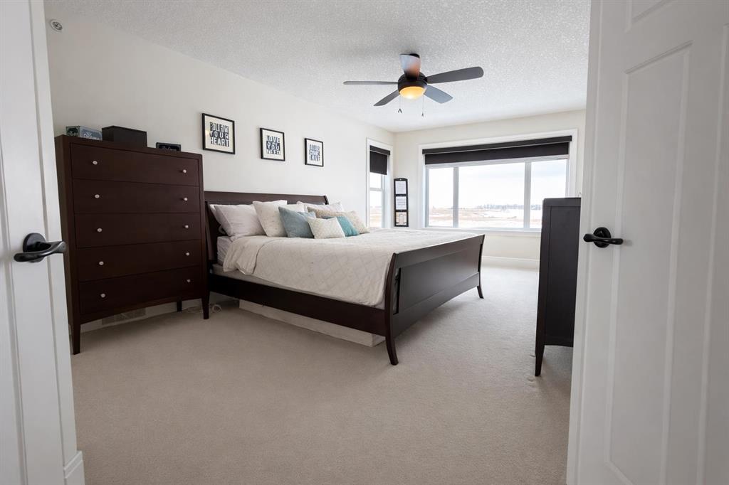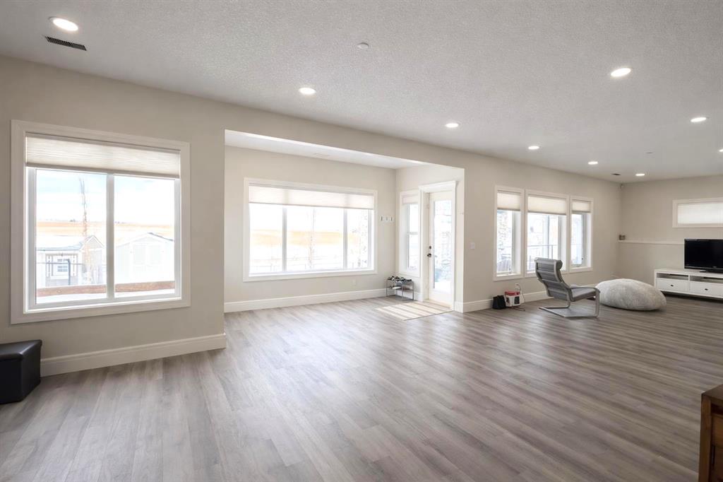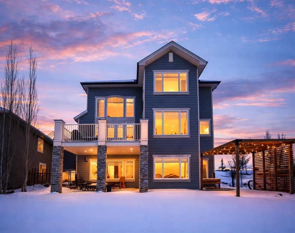 Welcome to prestigious Lakes of Muirfield—an exceptional luxury family home offering over 4,200 sq ft of developed living space, perfectly positioned backing onto the canal and golf course with greenspace to both the side and rear, creating a rare private setting with no neighbours behind. This stunning residence showcases 4 bedrooms and 4 bathrooms, impressive curb appeal, and a grand interior featuring hardwood flooring and a striking curved staircase. The main level boasts a vaulted family room with oversized windows, a formal dining room, and an elegant open-to-above living room flooded with natural light. The spacious kitchen is designed for both function and style with rich cappuccino cabinetry, a corner pantry, a large sit-up island with prep sink, an additional main sink overlooking the views, and a bright dining nook with tray ceiling and direct access to the large deck with gas line for BBQ—perfect for entertaining. A private office/den with sleek sliding pocket doors and a powder room complete this level. Upstairs, a grand double-door entry leads to the luxurious primary retreat featuring a spa-inspired ensuite with oversized shower, standalone soaker tub, dual vanities, and a generous walk-in closet, while two additional bedrooms—both with walk-in closets—along with a full bathroom and convenient upper laundry complete the upper floor, all enhanced by open-to-below design elements that elevate the home’s sense of space and elegance. The fully developed basement offers vinyl plank flooring throughout, a large recreation/entertainment space, gym area, fourth bedroom, and full bathroom, with direct access to a covered patio and beautifully landscaped yard featuring a pergola and shed, all set against serene canal and golf course views. Ideally located just minutes to Strathmore, Langdon, and Chestermere, with an easy 20-minute commute to Calgary and close proximity to the new De Havilland plant—this is luxury living in a peaceful, scenic setting.
